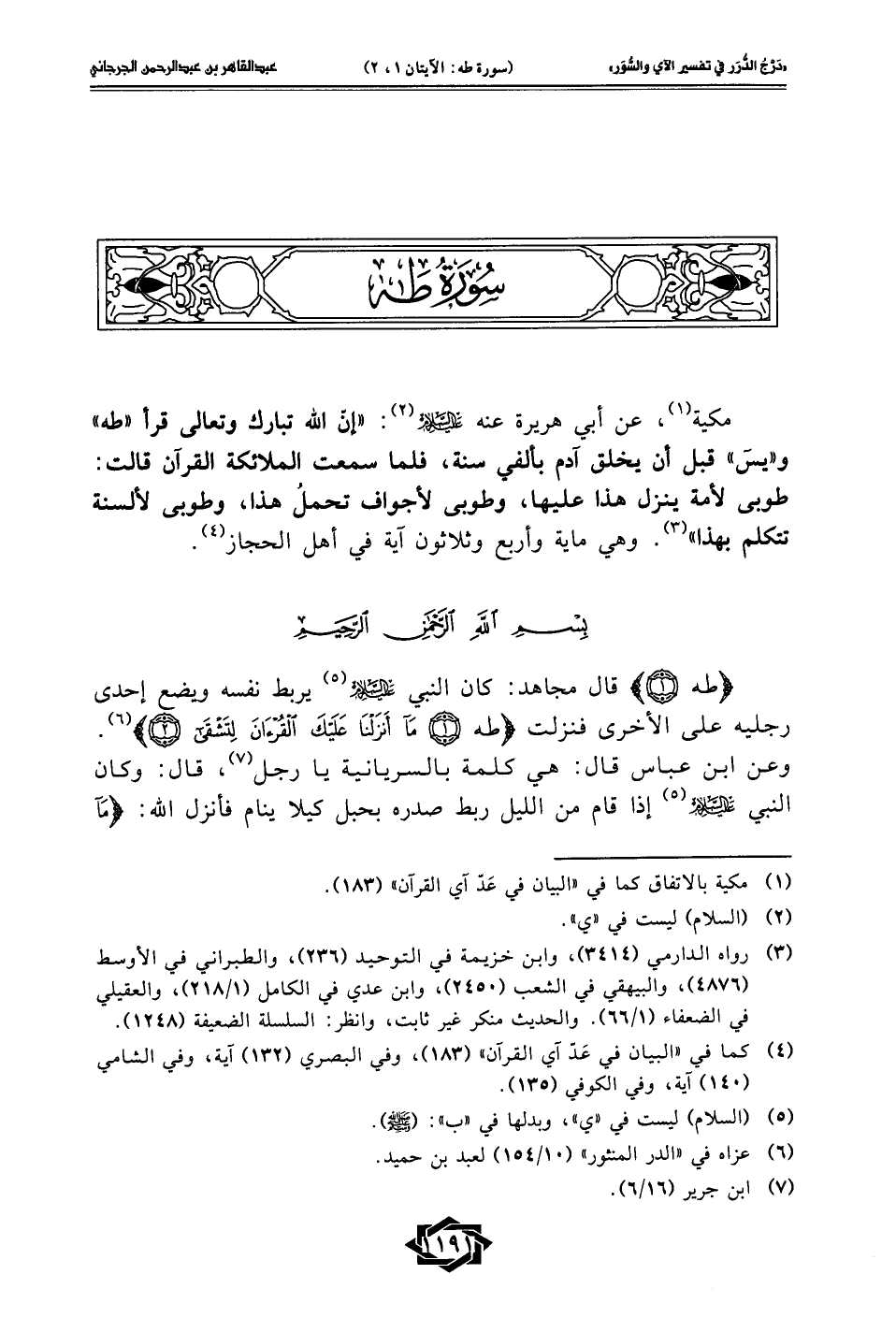 {طه (1)} قال مجاهد: كان النبي -عليه السلام - (¬5) يربط نفسه ويضع إحدى رجليه على الأخرى فنزلت {طه (1) مَا أَنْزَلْنَا عَلَيْكَ الْقُرْآنَ لِتَشْقَى (2)} (¬6). وعن ابن عباس قال: هي كلمة بالسريانية يا رجل (¬7)، قال: وكان النبي - عليه السلام - (5) إذا قام من الليل ربط صدره بحبل كيلا ينام فأنزل الله: {مَا