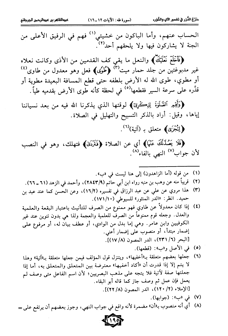 (¬4) إذا كان معدولًا عن طاوي فهو ممنوع من الصرف للتأنيث باعتبار البقعة والعلمية والعدل. وجعله قوم ممنوعًا من الصرف للعلمية والعجمة ولذا هي بدون تنوين عند غير الكوفيين وابن عامر. وهي إما بدل من الوادي، أو عطف بيان له، أو مرفوع على إضمار مبتدأ، أو منصوب على إضمار أعني.