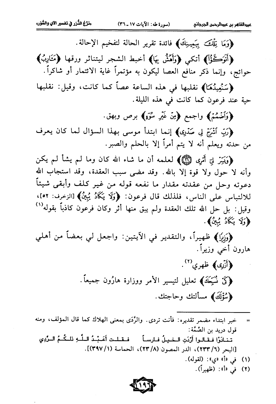 {وَيَسِّرْ لِي أَمْرِي} لعلمه أن ما شاء الله كان وما لم يشأ لم يكن وأنه لا حول ولا قوة إلا بالله. وقد مضى سبب العقدة، وقد استجاب الله دعوته وحل من عقدته مقدار ما نفعه قوله من غير كلف وأبقى شيئًا للالتباس على الناس، فلذلك قال فرعون: {وَلَا يَكَادُ يُبِينُ} [الزخرف: 52] وقيل: بل حل الله تلك العقدة ولم يبق منها أثر وكان فرعون كاذبًا بقوله (¬1) {وَلَا يَكَادُ يُبِينُ}.