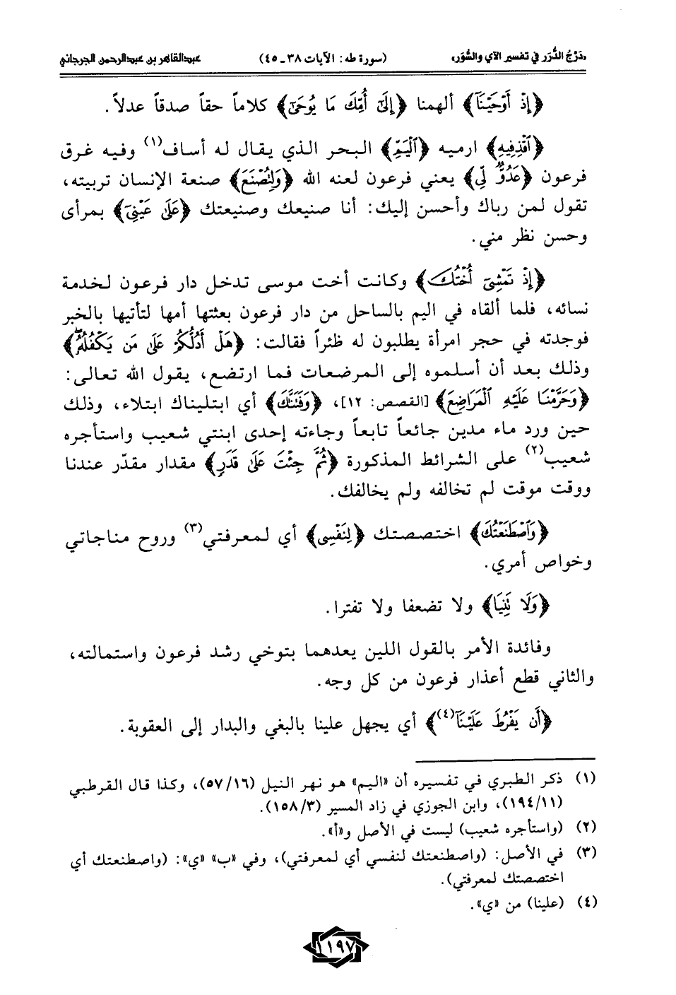 {إِذْ تَمْشِي أُخْتُكَ} وكانت أخت موسى تدخل دار فرعون لخدمة نسائه، فلما ألقاه في اليم بالساحل من دار فرعون بعثتها أمها لتأتيها بالخبر فوجدته في حجر امرأة يطلبون له ظئرًا فقالت: {هَلْ أَدُلُّكُمْ عَلَى مَنْ يَكْفُلُهُ} وذلك بعد أن أسلموه إلى المرضعات فما ارتضع، يقول الله تعالى: {وَحَرَّمْنَا عَلَيْهِ الْمَرَاضِعَ} [القصص: 12]، {وَفَتَنَّاكَ} أي ابتليناك ابتلاء، وذلك حين ورد ماء مدين جائعًا تابعًا وجاءته إحدى ابنتي شعيب واستأجره شعيب (¬2) على الشرائط المذكورة {ثُمَّ جِئْتَ عَلَى قَدَرٍ} مقدار مقدّر عندنا ووقت موقت لم تخالفه ولم يخالفك.