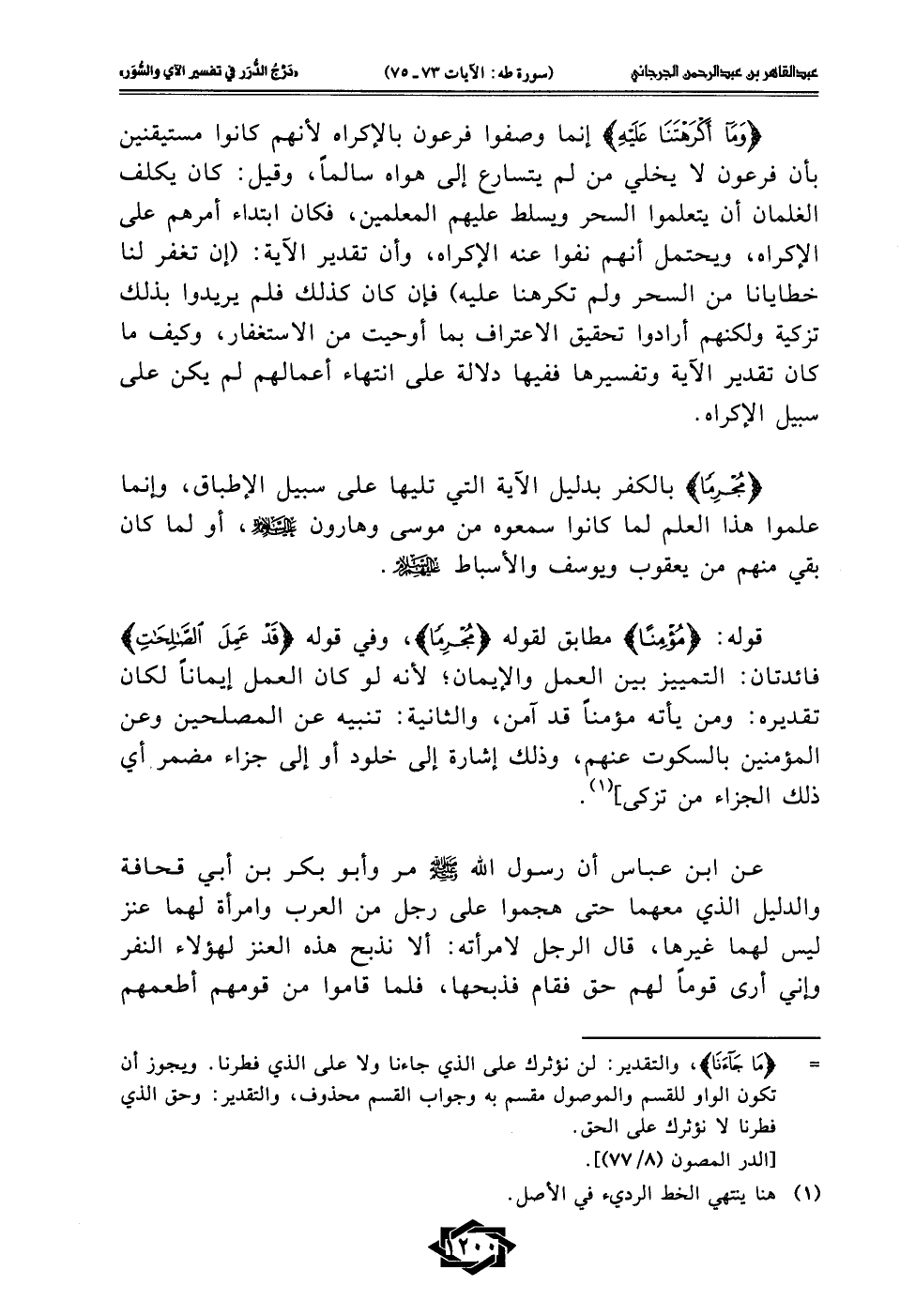 = {مَا جَاءَنَا}، والتقدير: لن نؤثرك على الذي جاءنا ولا على الذي فطرنا. ويجوز أن تكون الواو للقسم والموصول مقسم به وجواب القسم محذوف، والتقدير: وحق الذي فطرنا لا نؤثرك على الحق.