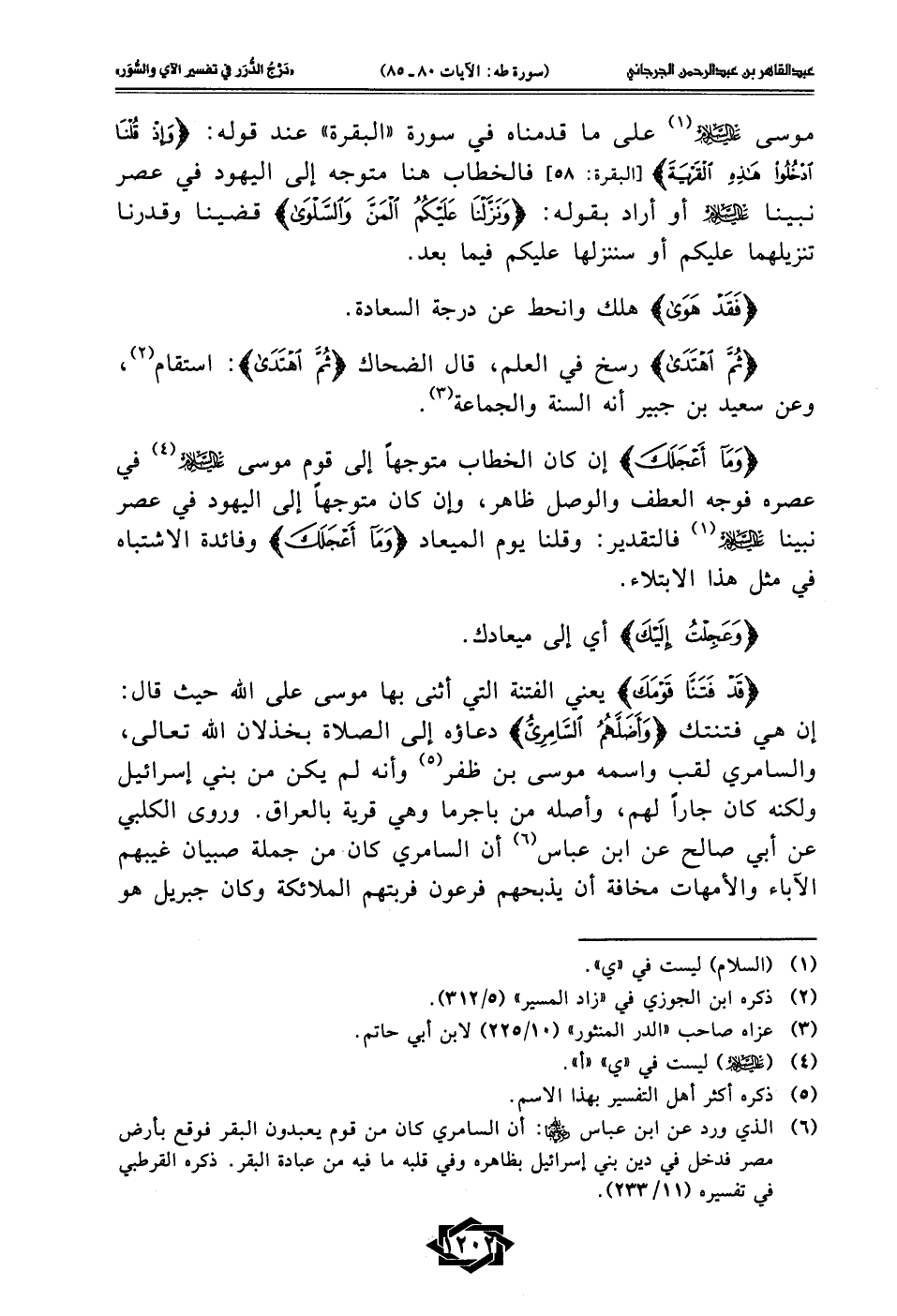 (¬6) الذي ورد عن ابن عباس - رضي الله عنهما -: أن السامري كان من قوم يعبدون البقر فوقع بأرض مصر فدخل في دين بني إسرائيل بظاهره وفي قلبه ما فيه من عبادة البقر. ذكره القرطبي في تفسيره (11/ 233).