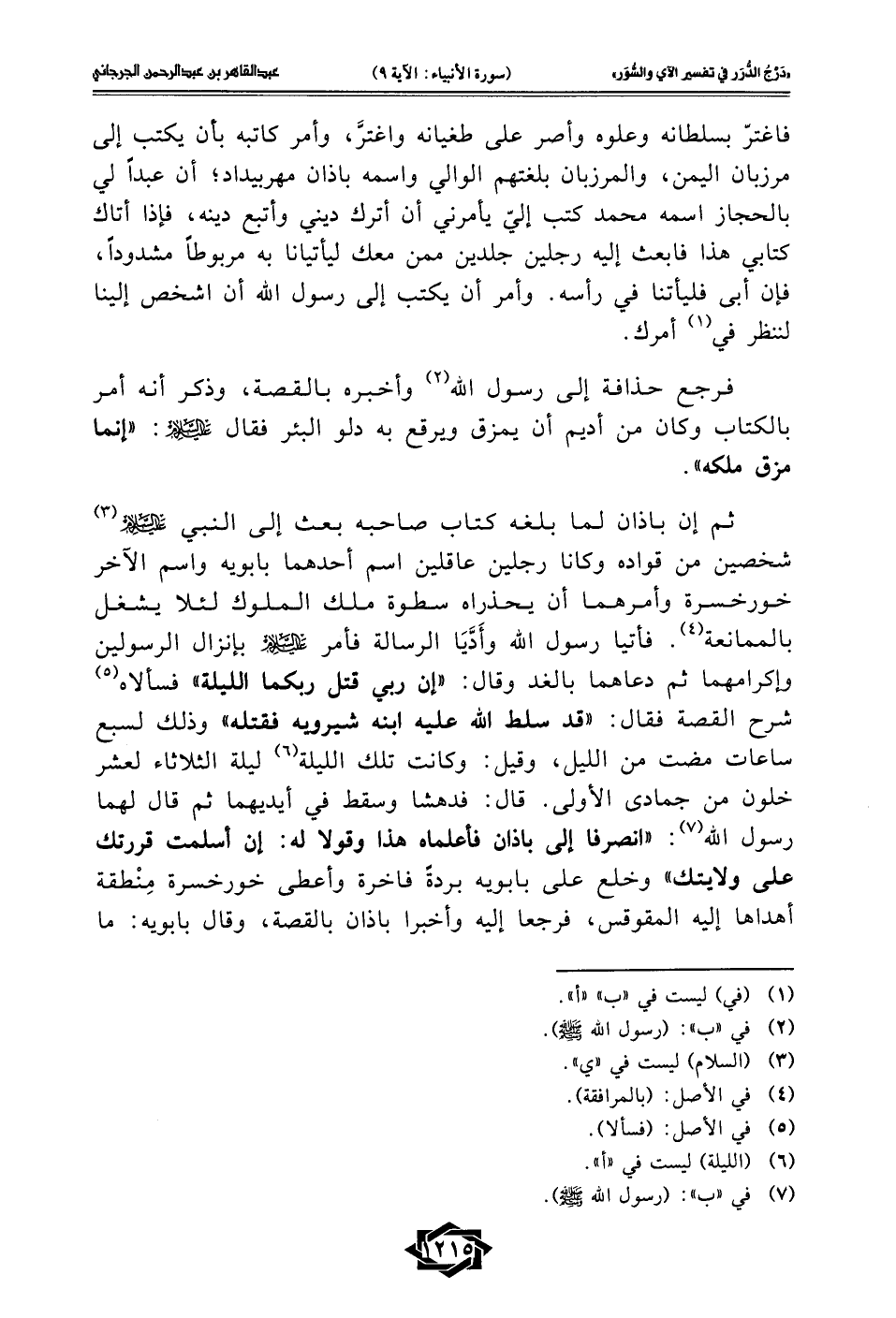 ثم إن باذان لما بلغه كتاب صاحبه بعث إلى النبي -عليه السلام- (¬3) شخصين من قواده وكانا رجلين عاقلين اسم أحدهما بابويه واسم الآخر خورخسرة وأمرهما أن يحذراه سطوة ملك الملوك لئلا يشغل بالممانعة (¬4). فأتيا رسول الله وأَدَّيَا الرسالة فأمر -عليه السلام- بإنزال الرسولين وإكرامهما ثم دعاهما بالغد وقال: "إن ربى قتل ربكما الليلة" فسألاه (¬5) شرح القصة فقال: "قد سلط الله عليه ابنْه شيرويه فقتله" وذلك لسبع ساعات مضت من الليل، وقيل: وكانت تلك الليلة (¬6) ليلة الثلاثاء لعشر خلون من جمادى الأولى. قال: فدهشا وسقط في أيديهما ثم قال لهما رسول الله (¬7): "انصرفا إلى باذان فاعلماه هذا وقولا له: إن أسلمت قررنك على ولايتك" وخلع على بابويه بردةً فاخرة وأعطى خورخسرة مِنْطقة أهداها إليه المقوقس، فرجعا إليه وأخبرا باذان بالقصة، وقال بابويه: ما