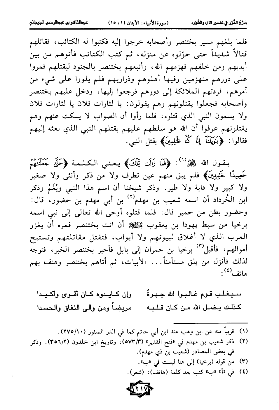 فلما بلغهم مسير بختنصر وأصحابه خرجوا إليه فكتبوا له الكتائب، فقاتلهم قتالًا شديدًا حتى حوّلوه عن منزله، ثم كتب الكتائب فأتوهم من بين أيديهم ومن خلفهم فهزمهم الله، وأتبعهم بختنصر بالجنود ليقتلهم فمروا على دورهم منهزمين وفيها أهلوهم وذراريهم فلم يلووا على شيء من أمرهم، فردتهم الملائكة إلى دورهم فرجعوا إليها، ودخل عليهم بختنصر وأصحابه فجعلوا يقتلونهم وهم يقولون: يا لثارات فلان يا لثارات فلان ولا يسمون النبي الذي قتلوه، فلما رأوا أن الصواب لا يسكت عنهم وهم يقتلونهم عرفوا أن الله هو سلطهم عليهم بقتلهم النبي الذي بعثه إليهم فقالوا: {يَا وَيْلَنَا إِنَّا كُنَّا ظَالِمِينَ} بقتل النبي.