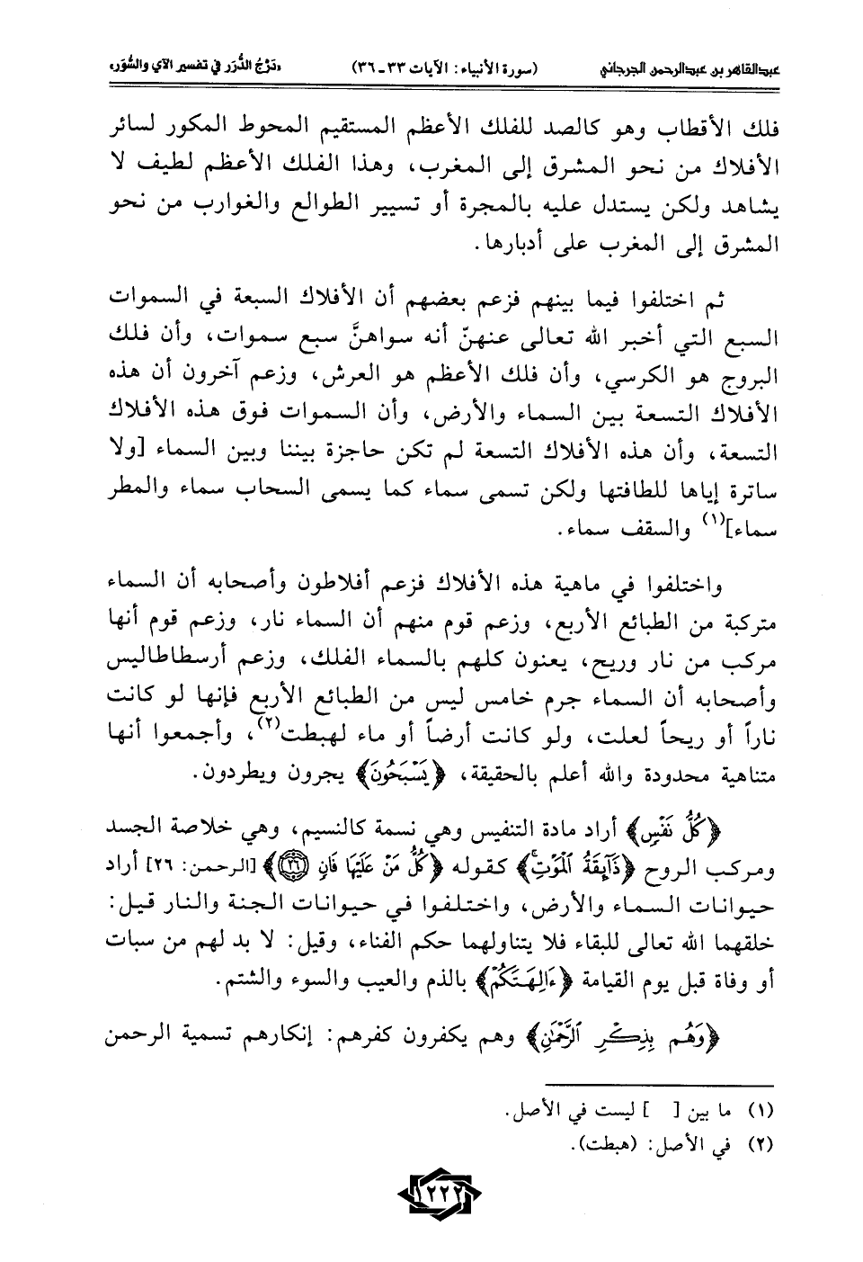 واختلفوا في ماهية هذه الأفلاك فزعم أفلاطون وأصحابه أن السماء متركبة من الطبائع الأربع، وزعم قوم منهم أن السماء نار، وزعم قوم أنها مركب من نار وريح، يعنون كلهم بالسماء الفلك، وزعم أرسطاطاليس وأصحابه أن السماء جرم خامس ليس من الطبائع الأربع فإنها لو كانت نارًا أو ريحًا لعلت، ولو كانت أرضًا أو ماء لهبطت (¬2)، وأجمعوا أنها متناهية محدودة والله أعلم بالحقيقة، {يَسْبَحُونَ} يجرون ويطردون.