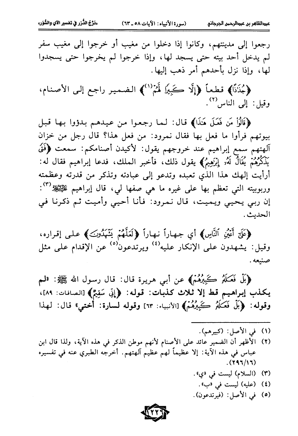 {بَلْ فَعَلَهُ كَبِيرُهُمْ} عن أبي هريرة قال: قال رسول الله - صلى الله عليه وسلم - "لم يكذب إبراهيم قط إلا ثلاث كذبات: قوله: {إِنِّي سَقِيمٌ} [الصافات: 89]، وقوله: {بَلْ فَعَلَهُ كَبِيرُهُمْ} [الأنبياء: 63] وقوله لسارة: أختي" قال: لهذا