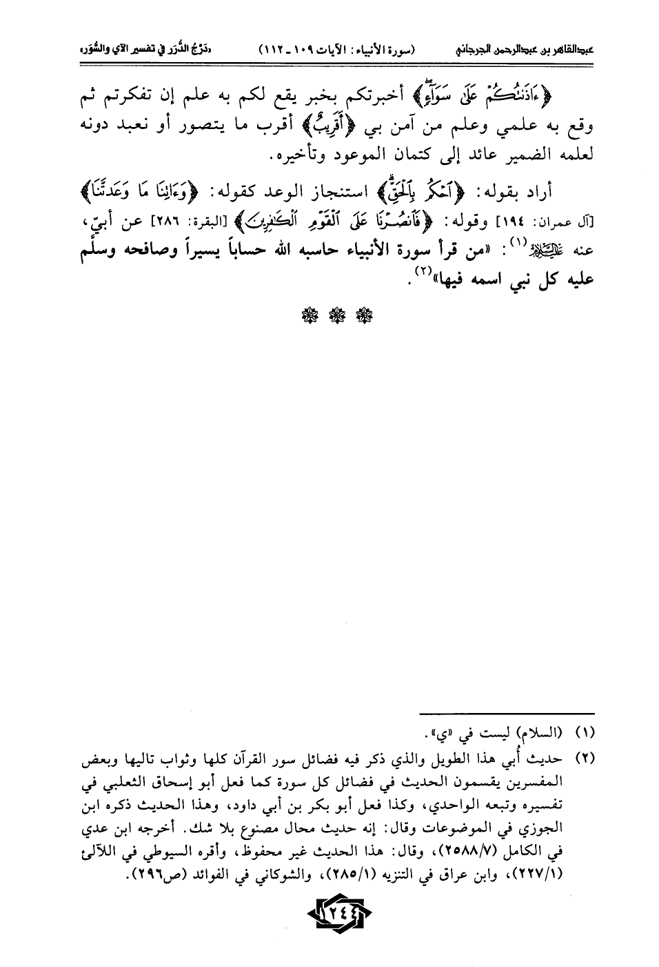 (¬2) حديث أُبي هذا الطويل والذي ذكر فيه فضائل سور القرآن كلها وثواب تاليها وبعض المفسرين يقسمون الحديث في فضائل كل سُورَةُ كما فعل أبو إسحاق الثعلبي في تفسيره وتبعه الواحدي، وكذا فعل أبو بكر بن أبي داود، وهذا الحديث ذكره ابن الجوزي في الموضوعات وقال: إنه حديث محال مصنوع بلا شك. أخرجه ابن عدي في الكامل (7/ 2588)، وقال: هذا الحديث غير محفوظ، وأقره السيوطي في اللآلئ (1/ 227)، وابن عراق في التنزيه (1/ 285)، والشوكاني في الفوائد (ص 296).