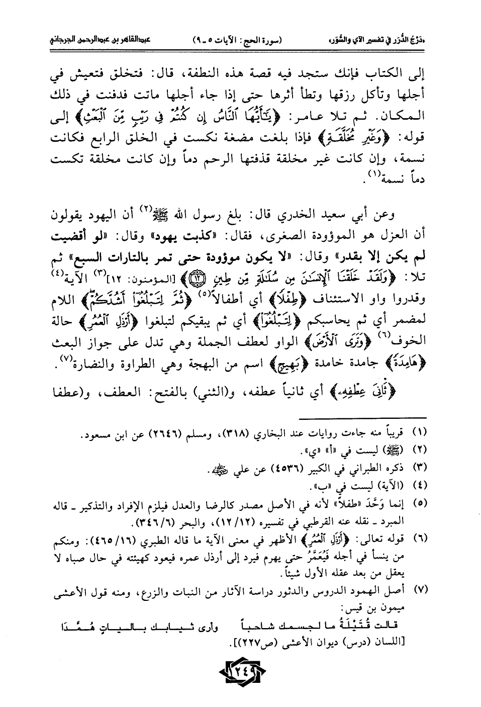وعن أبي سعيد الخدري قال: بلغ رسول الله - صلى الله عليه وسلم - (¬2) أن اليهود يقولون أن العزل هو الموؤودة الصغرى، فقال: "كذبت يهود" وقال: "لو أقضيت لم يكن إلا بقدر" وقال: "لا يكون موؤودة حتى تمر بالتارات السبع" ثم تلا: {وَلَقَدْ خَلَقْنَا الْإِنْسَانَ مِنْ سُلَالَةٍ مِنْ طِينٍ (12)} [المؤمنون: 12] (¬3) الآية (¬4) وقدروا واو الاستئناف {طِفْلًا} أي أطفالًا (¬5) {ثُمَّ لِتَبْلُغُوا أَشُدَّكُمْ} اللام لمضمر أي ثم يحاسبكم {لِتَبْلُغُوا} أي ثم يبقيكم لتبلغوا {أَرْذَلِ الْعُمُرِ} حالة الخوف (¬6) {وَتَرَى الْأَرْضَ} الواو لعطف الجملة وهي تدل على جواز البعث {هَامِدَةً} جامدة خامدة {بَهِيجٍ} اسم من البهجة وهي الطراوة والنضارة (¬7).