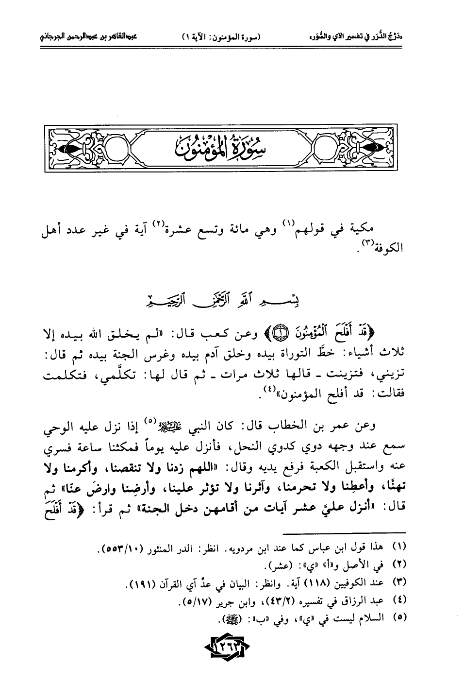 {قَدْ أَفْلَحَ الْمُؤْمِنُونَ (1)} وعن كعب قال:" لم يخلق الله بيده إلا ثلاث أشياء: خطَّ التوراة بيده وخلق آدم بيده وغرس الجنة بيده ثم قال: تزيني، فتزينت - قالها ثلاث مرات- ثم قال لها: تكلَّمي، فتكلمت فقالت: قد أفلح المؤمنون" (¬4).