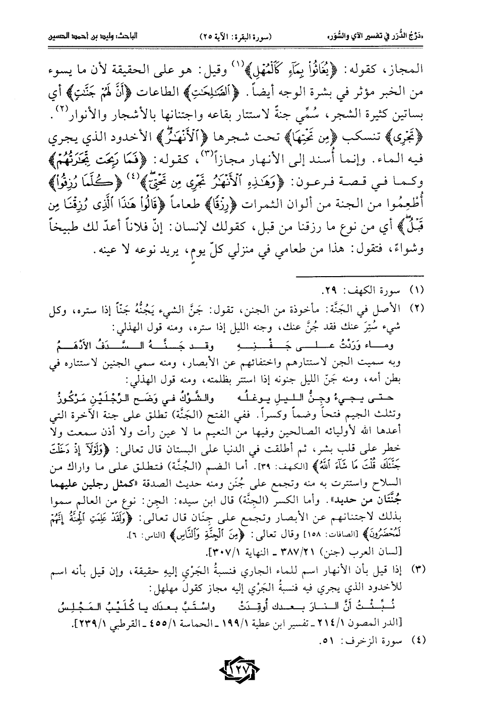 المجاز، كقوله: {يُغَاثُوا بِمَاءٍ كَالْمُهْلِ} (¬1) وقيل: هو على الحقيقة لأن ما يسوء من الخبر مؤثر في بشرة الوجه أيضًا. {الصَّالِحَاتِ} الطاعات {أَنَّ لَهُمْ جَنَّاتٍ} أي بساتين كثيرة الشجر، سُمِّي جنةً لاستتار بقاءه واجتنانها بالأشجار والأنوار (¬2). {تَجْرِي} تنسكب {مِنْ تَحْتِهَا} تحت شجرها {الْأَنْهَار} الأخدود الذي يجري فيه الماء. وإنما أُسند إلى الأنهار مجازًا (¬3)، كقوله: {فَمَا رَبِحَتْ تِجَارَتُهُمْ} وكما في قصة فرعون: {وَهَذِهِ الْأَنْهَارُ تَجْرِي مِنْ تَحْتِي} (¬4) {كُلَّمَا رُزِقُوا} أُطْعِمُوا من الجنة من ألوان الثمرات {رِزْقًا} طعامًا {قَالُوا هَذَا الَّذِي رُزِقْنَا مِنْ قَبْلُ} أي من نوع ما رزقنا من قبل، كقولك لإنسان: إنَّ فلانًا أعدّ لك طبيخًا وشواءً، فتقول: هذا من طعامي في منزلي كلّ يومٍ، يريد نوعه لا عينه.