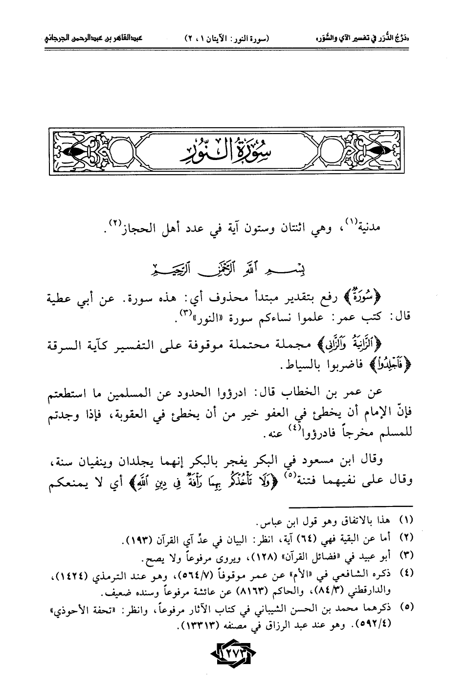 {سُورَةٌ} رفع بتقدير مبتدأ محذوف أي: هذه سورة. عن أبي عطية قال: كتب عمر: علموا نساءكم سورة "النور" (¬3).