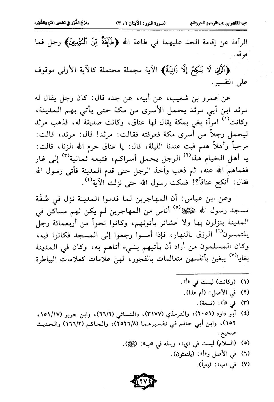 عن عمرو بن شعيب، عن أبيه، عن جده قال: كان رجل يقال له مرثد ابن أبي مرثد يحمل الأسرى من مكة حتى يأتي بهم المدينة، وكانت (¬1) امرأة بغي بمكة يقال لها عناق، وكانت صديقة له، فذهب مرثد ليحمل رجلًا من أسرى مكة فعرفته فقالت: مرثد! قال: مرثد، قالت: مرحبًا وأهلًا هلم فبت عندنا الليلة، قال: يا عناق حرم الله الزنا، قالت: يا أهل الخيام هذا (¬2) الرجل يحمل أسراكم، فتبعه ثمانية (¬3) إلى غار فغماهم الله عنه، ثم ذهب وأخذ الرجل حتى قدم المدينة فأتى رسول الله فقال: أنكح عناقًا؟! فسكت رسول الله حتى نزلت الآية (¬4).