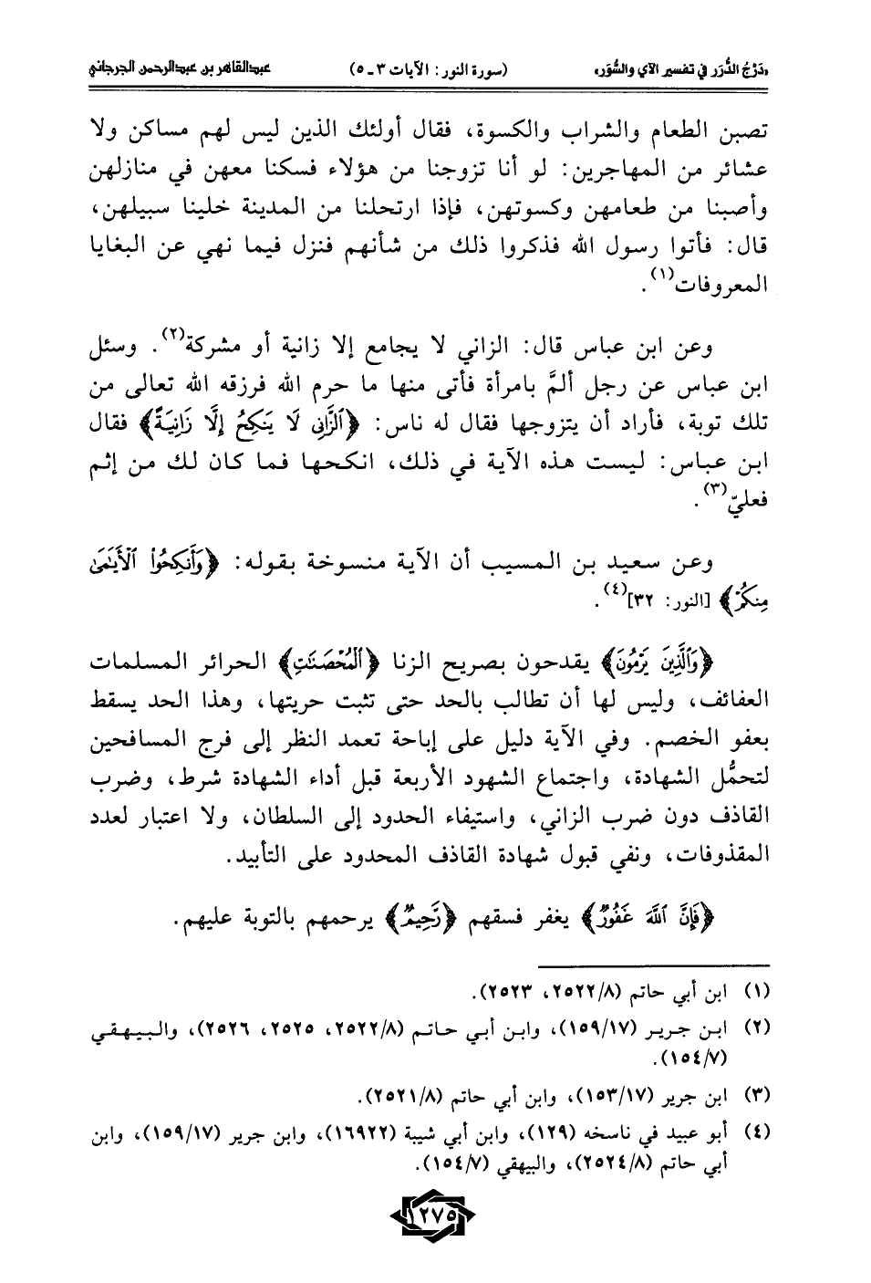 {وَالَّذِينَ يَرْمُونَ} يقدحون بصريح الزنا {الْمُحْصَنَاتِ} الحرائر المسلمات العفائف، وليس لها أن تطالب بالحد حتى تثبت حريتها، وهذا الحد يسقط بعفو الخصم. وفي الآية دليل على إباحة تعمد النظر إلى فرج المسافحين لتحمُّل الشهادة، واجتماع الشهود الأربعة قبل أداء الشهادة شرط، وضرب القاذف دون ضرب الزاني، واستيفاء الحدود إلى السلطان، ولا اعتبار لعدد المقذوفات، ونفي قبول شهادة القاذف المحدود على التأبيد.