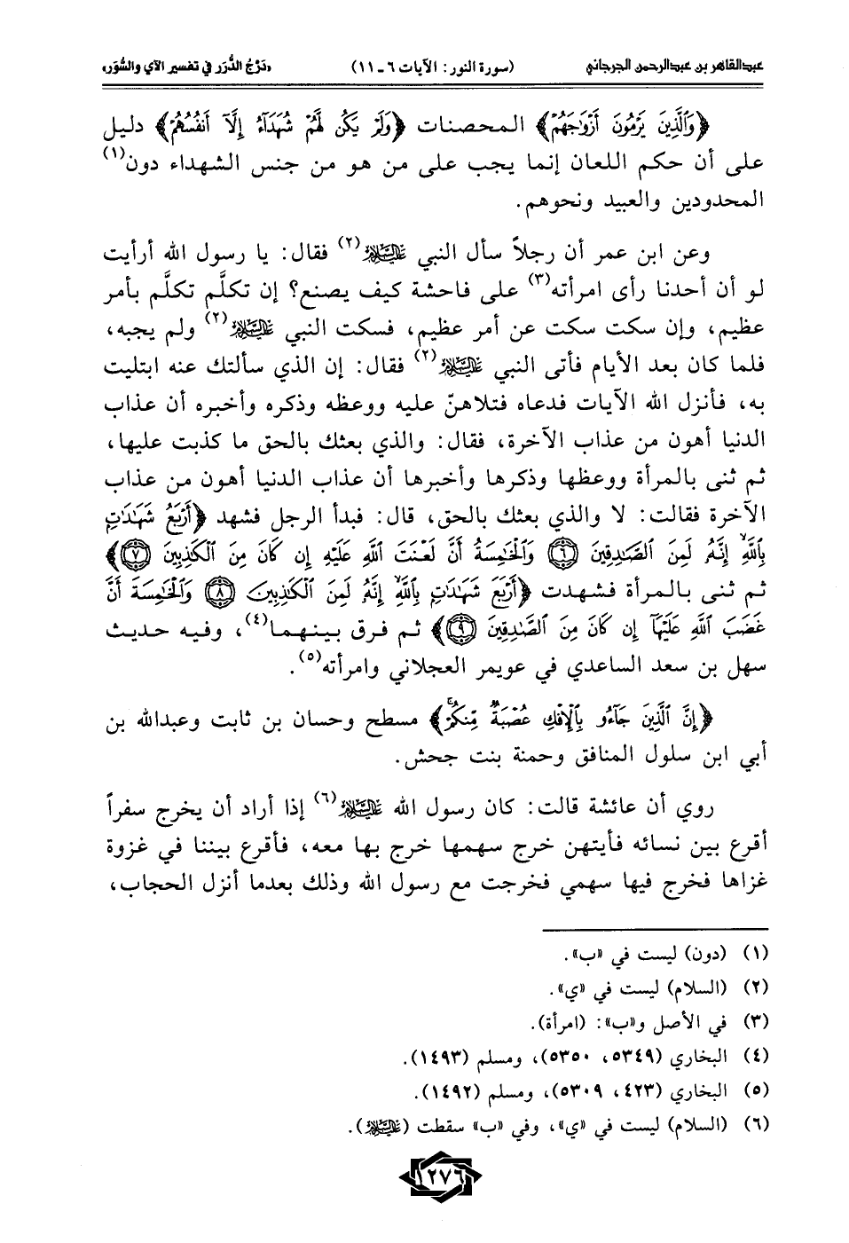 وعن ابن عمر أن رجلًا سأل النبي -عليه السلام- (¬2) فقال: يا رسول الله أرأيت لو أن أحدنا رأى امرأته (¬3) على فاحشة كيف يصنع؟ إن تكلَّم تكلَّم بأمر عظيم، هان سكت سكت عن أمر عظيم، فسكت النبي -عليه السلام- (2) ولم يجبه، فلما كان بعد الأيام فأتى النبي -عليه السلام- (2) فقال: إن الذي سألتك عنه ابتليت به، فأنزل الله الآيات فدعاه فتلاهنّ عليه ووعظه وذكره وأخبره أن عذاب الدنيا أهون من عذاب الآخرة، فقال: والذي بعثك بالحق ما كذبت عليها، ثم ثنى بالمرأة ووعظها وذكرها وأخبرها أن عذاب الدنيا أهون من عذاب الآخرة فقالت: لا والذي بعثك بالحق، قال: فبدأ الرجل فشهد {أَرْبَعُ شَهَادَاتٍ بِاللَّهِ إِنَّهُ لَمِنَ الصَّادِقِينَ (6) وَالْخَامِسَةُ أَنَّ لَعْنَتَ اللَّهِ عَلَيْهِ إِنْ كَانَ مِنَ الْكَاذِبِينَ (7)} ثم ثنى بالمرأة فشهدت {تَشْهَدَ أَرْبَعَ شَهَادَاتٍ بِاللَّهِ إِنَّهُ لَمِنَ الْكَاذِبِينَ (8) وَالْخَامِسَةَ أَنَّ غَضَبَ اللَّهِ عَلَيْهَا إِنْ كَانَ مِنَ الصَّادِقِينَ (9)} ثم فرق بينهما (¬4)، وفيه حديث سهل بن سعد الساعدي في عويمر العجلاني وامرأته (¬5).