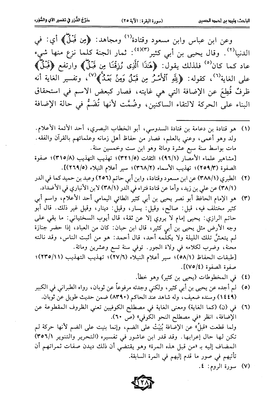 (¬1) هو قتادة بن دعامة بن قتادة السدوسي، أبو الخطاب البصري، أحد الأئمة الأعلام. ولد وهو أعمى، وعني بالعلم، فصار من حفاظ أهل زمانه وعلمائهم بالقرآن والفقه. مات بواسط سنة سبع عشرة ومائة وهو ابن ست وخمسين سنة.