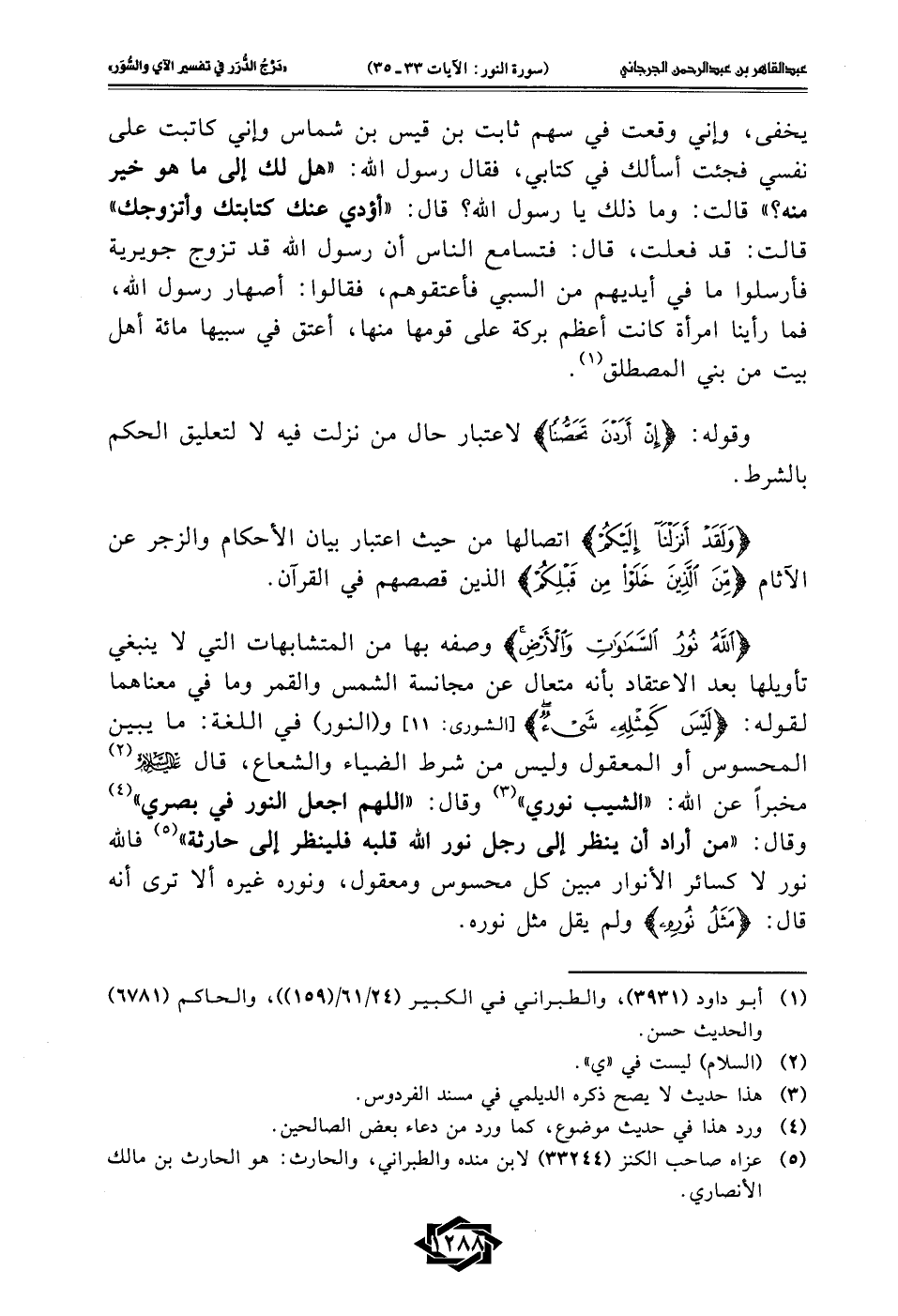 {اللَّهُ نُورُ السَّمَاوَاتِ وَالْأَرْضِ} وصفه بها من المتشابهات التي لا ينبغي تأويلها بعد الاعتقاد بأنه متعال عن مجانسة الشمس والقمر وما في معناهما لقوله: {لَيْسَ كَمِثْلِهِ شَيْءٌ} [الشورى: 11] و (النور) في اللغة: ما يبين المحسوس أو المعقول وليس من شرط الضياء والشعاع، قال -عليه السلام- (¬2) مخبرًا عن الله: "الشيب نوري" (¬3) وقال: "اللهم اجعل النور في بصري" (¬4) وقال: "من أراد أن ينظر إلى رجل نور الله قلبه فلينظر إلى حارثة" (¬5) فالله نور لا كسائر الأنوار مبين كل محسوس ومعقول، ونوره غيره ألا ترى أنه قال: {مَثَلُ نُورِهِ} ولم يقل مثل نوره.