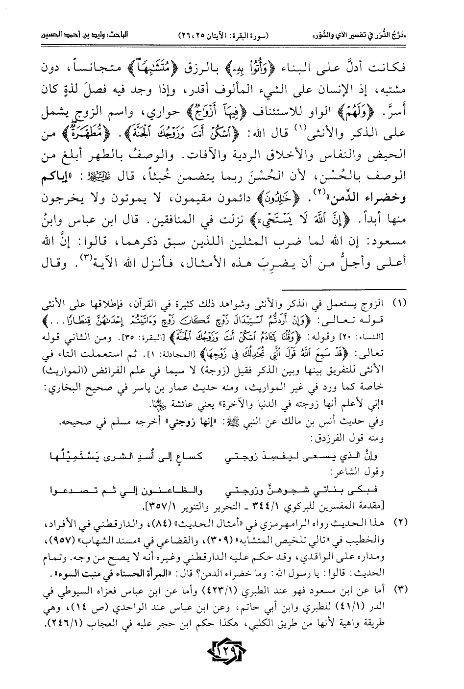 فكانت أدلَّ على البناء {وَأُتُوا بِهِ} بالرزق {مُتَشَابِهًا} متجانسًا، دون مشتبه، إذ الإنسان على الشيء المألوف أقدر، وإذا وجد فيه فصلَ لذةٍ كان أَسرَّ. {وَلَهُمْ} الواو للاستئناف {فِيهَا أَزْوَاجٌ} حواري، واسم الزوج يشمل على الذكر والأنثى (¬1) قال الله: {اسْكُنْ أَنْتَ وَزَوْجُكَ الْجَنَّةَ}. {مُطَهَّرَةٌ} من الحيض والنفاس والأخلاق الردية والآفات. والوصفُ بالطهر أبلغ من الوصف بالحُسْن, لأن الحُسْنَ ربما يتضمن خُبثًا، قال - صلى الله عليه وسلم -: "إياكم وخضراء الدِّمن" (¬2). {خَالِدُونَ} دائمودن مقيمون، لا يموتون ولا يخرجون منها أبدًا. {إِنَّ اللَّهَ لَا يَسْتَحْيِي} نزلت في المنافقين. قال ابن عباس وابنُ مسعود: إن الله لما ضرب المثلين اللذين سبق ذكرهما، قالوا: إنَّ الله أعلى وأجلُّ من أن يضرِبَ هذه الأمثال، فأنزل الله الآية (¬3). وقال