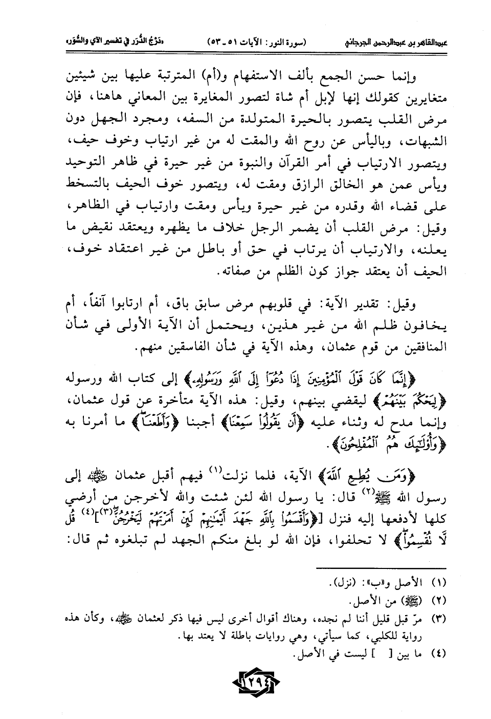 وقيل: تقدير الآية: في قلوبهم مرض سابق باق، أم ارتابوا آنفًا، أم يخافون ظلم الله من غير هذين، ويحتمل أن الآية الأولى في شأن المنافقين من قوم عثمان، وهذه الآية في شأن الفاسقين منهم.