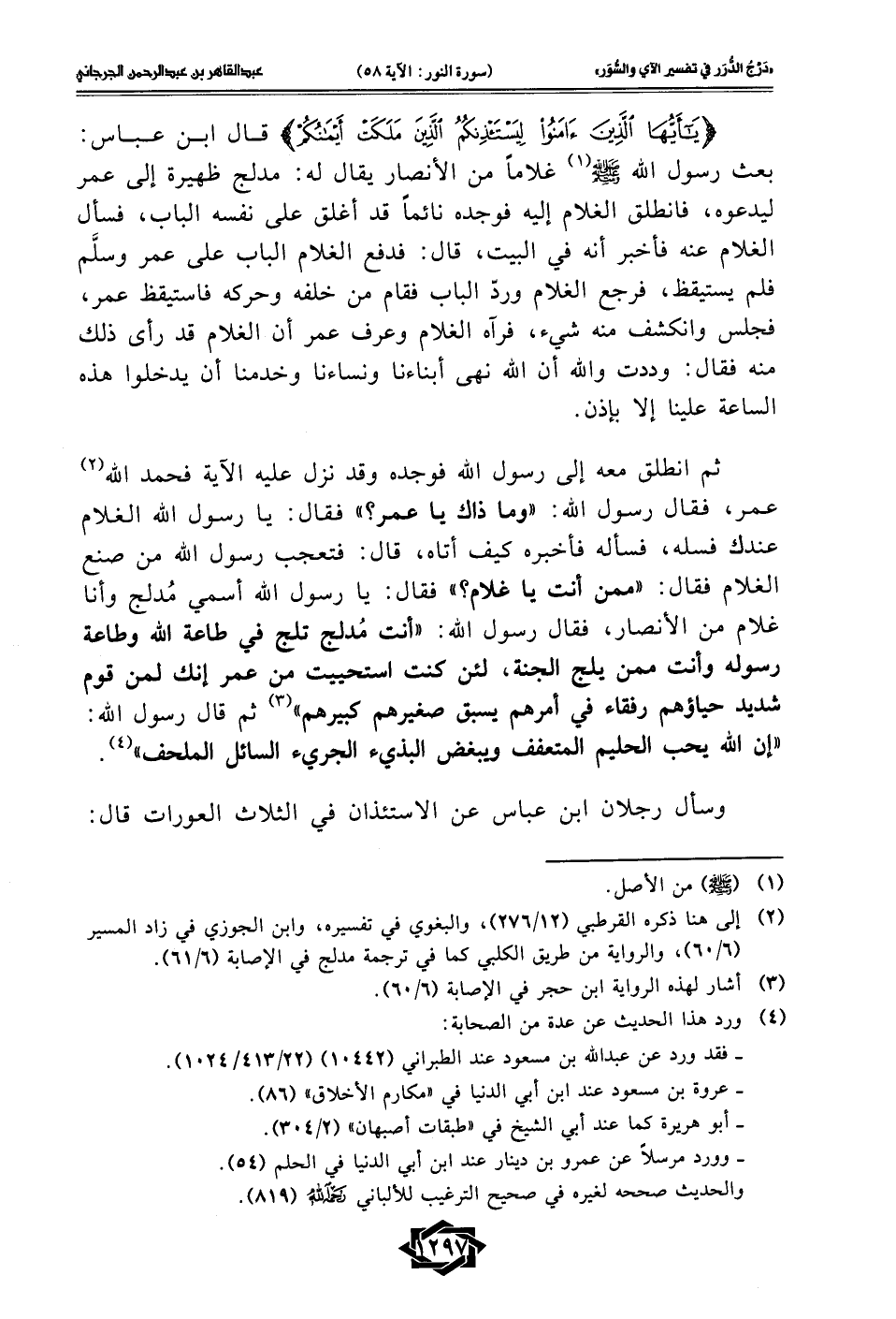 {يَا أَيُّهَا الَّذِينَ آمَنُوا لِيَسْتَأْذِنْكُمُ الَّذِينَ مَلَكَتْ أَيْمَانُكُمْ} قال ابن عباس: بعث رسول الله - صلى الله عليه وسلم - (¬1) غلامًا من الأنصار يقال له: مدلج ظهيرة إلى عمر ليدعوه، فانطلق الغلام إليه فوجده نائمًا قد أغلق على نفسه الباب، فسأل الغلام عنه فأخبر أنه في البيت، قال: فدفع الغلام الباب على عمر وسلَّم فلم يستيقظ، فرجع الغلام وردّ الباب فقام من خلفه وحركه فاستيقظ عمر، فجلس وانكشف منه شيء، فرآه الغلام وعرف عمر أن الغلام قد رأى ذلك منه فقال: وددت والله أن الله نهى أبناءنا ونساءنا وخدمنا أن يدخلوا هذه الساعة علينا إلا بإذن.