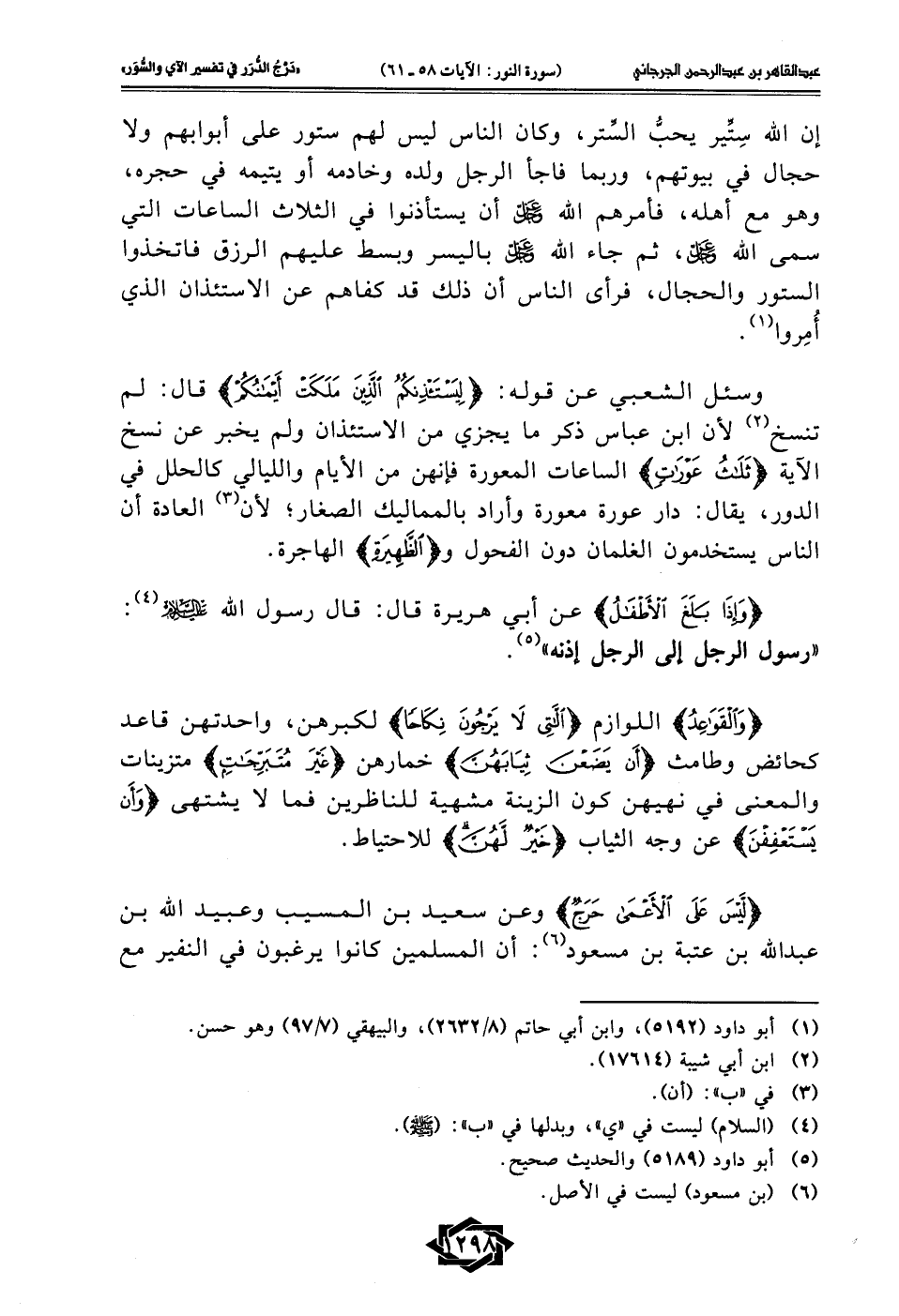 إن الله سِتِّير يحبُّ السِّتر، وكان الناس ليس لهم ستور على أبوابهم ولا حج الذي بيوتهم، وربما فاجأ الرجل ولده وخادمه أو يتيمه في حجره، وهو مع أهله، فأمرهم الله -عَزَّ وَجَلَّ- أن يستأذنوا في الثلاث الساعات التي سمى الله -عَزَّ وَجَلَّ-، ثم جاء الله -عَزَّ وَجَلَّ- باليسر وبسط عليهم الرزق فاتخذوا الستور والحجال، فرأى الناس أن ذلك قد كفاهم عن الاستئذان الذي أُمِروا (¬1).