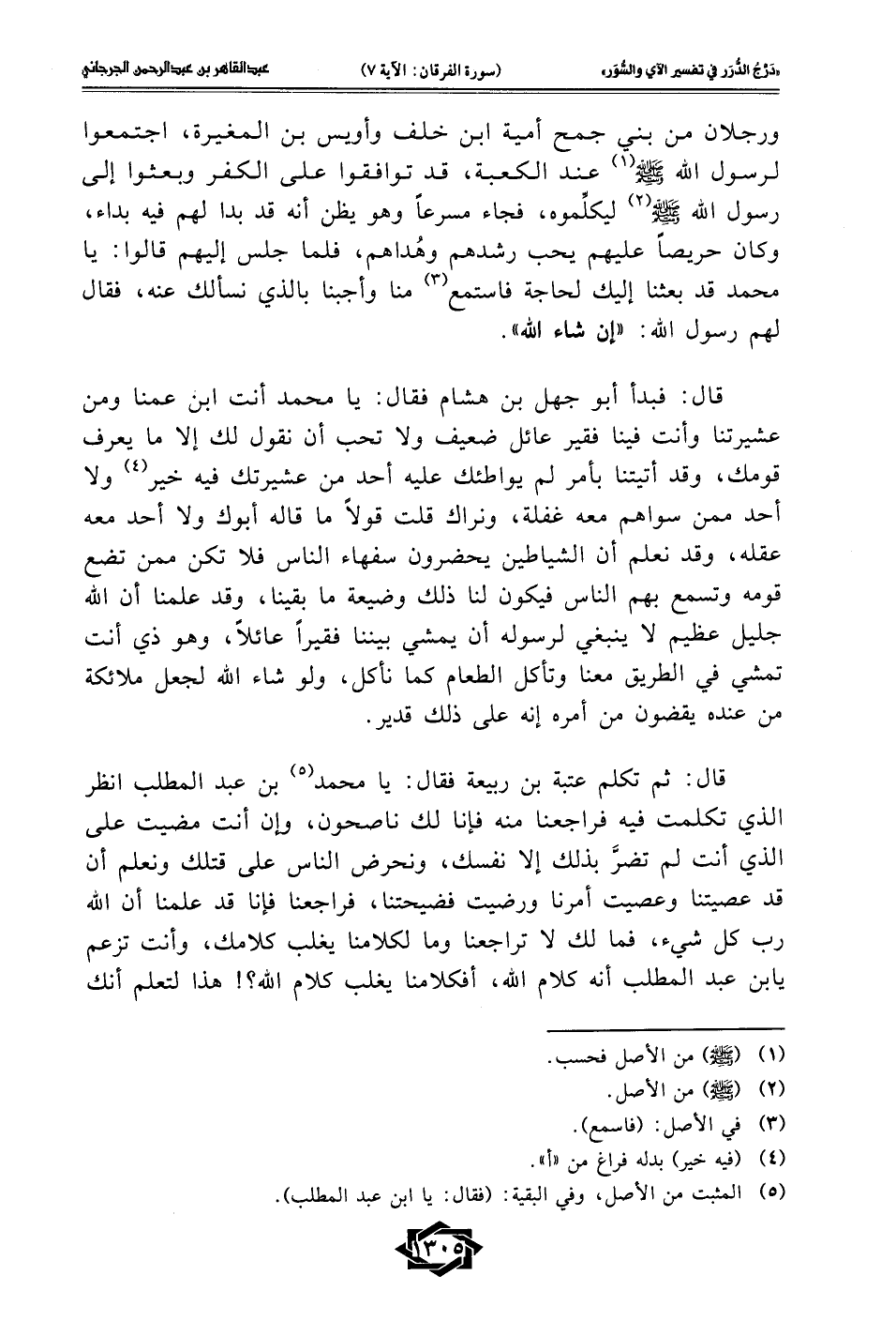ورجلان من بني جمح أمية ابن خلف وأويس بن المغيرة، اجتمعوا لرسول الله - صلى الله عليه وسلم - (¬1) عند الكعبة، قد توافقوا على الكفر وبعثوا إلى رسول الله - صلى الله عليه وسلم - (¬2) ليكلَّموه، فجاء مسرعًا وهو يظن أنه قد بدا لهم فيه بداء، وكان حريصًا عليهم يحمب رشدهم وهُداهم، فلما جلس إليهم قالوا: يا محمَّد قد بعثنا إليك لحاجة فاستمع (¬3) منا وأجنا بالذي نسألك عنه، فقال لهم رسول الله: "إن شاء الله".