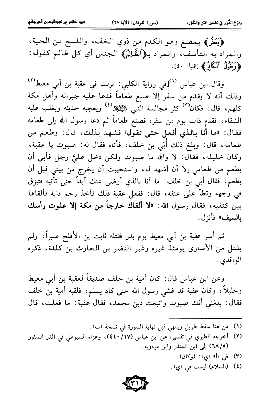 وقال ابن عباس (¬1) [في رواية الكلبي: نزلت في عقبة بن أبي معيط (¬2) وذلك أنه لا يقدم من سفر إلا صنع طعامًا فدعا عليه جيرانه وأهل مكة كلهم، قال: فكان (¬3) كثر مجالسة النبي -عليه السلام- (¬4) ويعجبه حديثه ويغلب عليه الشقاء، فقدم ذات يوم من سفره فصنع طعامًا ثم دعا رسول الله إلى طعامه فقال: "ما أنا بالذي أفعل حتى تقول" فشهد بذلك، قال: وطعم من طعامه، قال: وبلغ ذلك أُبَي بن خلف، فأتاه فقال له: صبوت يا عقبة، وكان خليله، فقال: لا والله ما صبوت ولكن دخل عليَّ رجل فأبى أن يطعم من طعامي إلا أن أشهد له، واستحييت أن يخرج من بيتي قبل أن يطعم، فقال أبي بن خلف: ما أنا بالذي أرضى عنك أبدًا حتى تأتيه فتبزق في وجهه وتطأ على عنقه، قال: ففعل عقبة ذلك فأخذ رحم دابة فألقاها بين كتفيه، فقال رسول الله: "لا ألقاك خارجًا من مكة إلا علوت رأسك بالسيف" فأنزل.