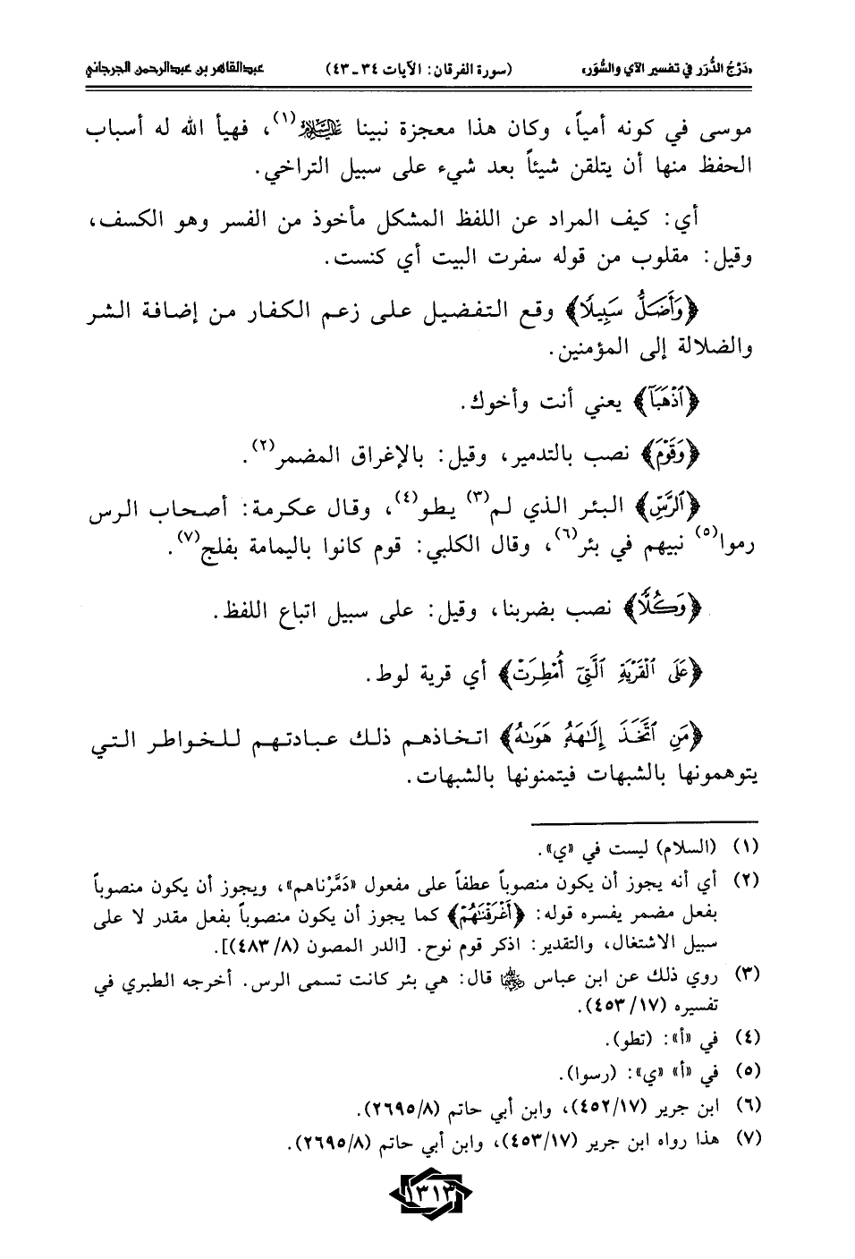 (¬3) روي ذلك عن ابن عباس - رضي الله عنهما - قال: هي بئر كانت تسمى الرس. أخرجه الطبري في تفسيره (17/ 453).