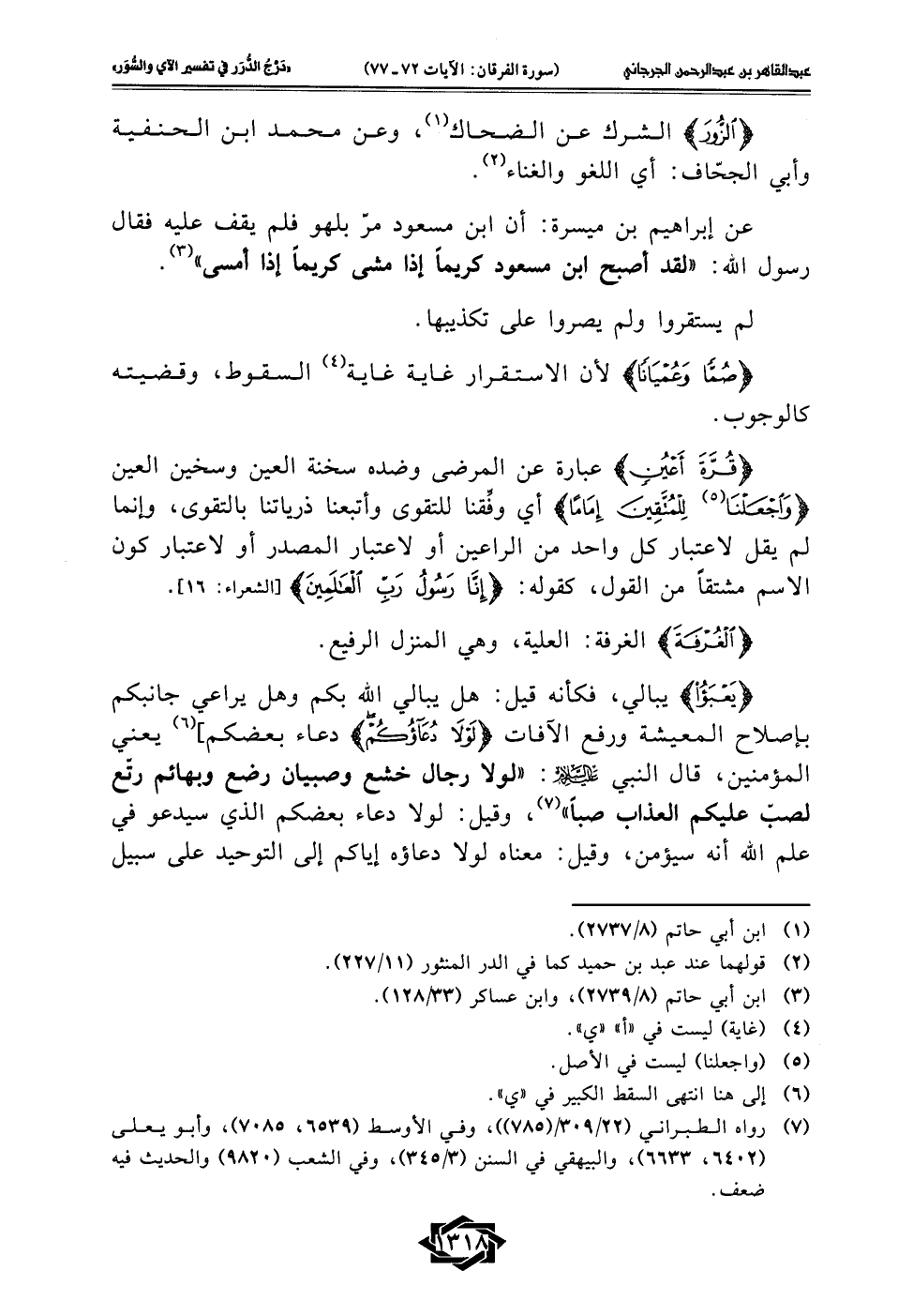{قُرَّةَ أَعْيُنٍ} عبارة عن المرضى وضده سخنة العين وسخين العين {وَاجْعَلْنَا (¬5) لِلْمُتَّقِينَ إِمَامًا} أي وفِّقنا للتقوى وأتبعنا ذرياتنا بالتقوى، وإنما لم يقل لاعتبار كل واحد من الراعين أو لاعتبار المصدر أو لاعتبار كون الاسم مشتقًا من القول، كقوله: {إِنَّا رَسُولُ رَبِّ الْعَالَمِينَ} [الشعراء: 16]. {الْغُرْفَةَ} الغرفة: العلية، وهي المنزل الرفيع.