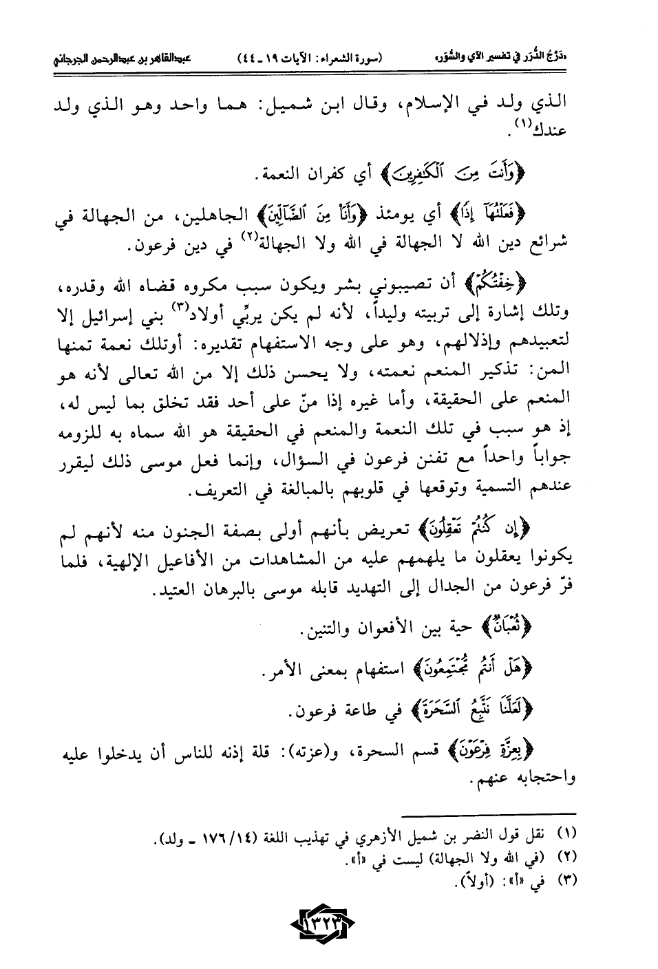 {خِفْتُكُمْ} أن تصيبوني بشر ويكون سبب مكروه قضاه الله وقدره، وتلك إشارة إلى تربيته وليدًا, لأنه لم يكن يربِّي أولاد (¬3) بني إسرائيل إلا لتعبيدهم وإذلالهم، وهو على وجه الاستفهام تقديره: أوتلك نعمة تمنها المن: تذكير المنعم نعمته، ولا يحسن ذلك إلا من الله تعالى لأنه هو المنعم على الحقيقة، وأما غيره إذا منّ على أحد فقد تخلق بما ليس له، إذ هو سبب في تلك النعمة والمنعم في الحقيقة هو الله سماه به للزومه جوابًا واحدًا مع تفنن فرعون في السؤال، وإنما فعل موسى ذلك ليقرر عندهم التسمية وتوقعها في قلوبهم بالمبالغة في التعريف.