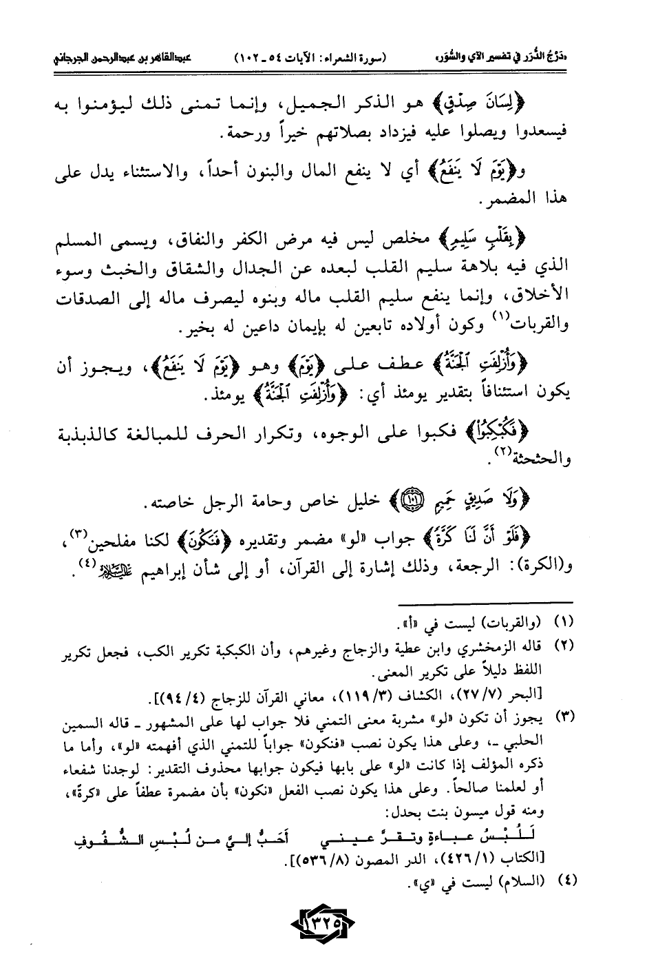 (¬3) يجوز أن تكون "لو" مشربة معنى التمني فلا جواب لها على المشهور -قاله السمين الحلبي-، وعلى هذا يكون نصب "فنكون" جوابًا للتمني الذي أفهمته "لو"، وأما ما ذكره المؤلف إذا كانت "لو" على بابها فيكون جوابها محذوف التقدير: لوجدنا شفعاء أو لعلمنا صالحًا. وعلى هذا يكون نصب الفعل "نكون" بأن مضمرة عطفًا على "كرةً"، ومنه قول ميسون بنت بحدل: