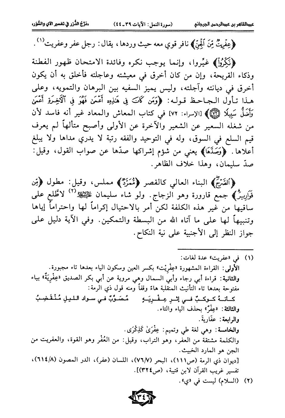 {الصَّرْحَ} البناء العالي كالقصر {مُمَرَّدٌ} ملس، وقيل: مطول {مِنْ قَوَارِيرَ} جمع قارورة وهو الزجاج. ولو شاء سليمان -عليه السلام- (¬2) لاطَّلع على ساقيها من غير هذه الكلفة لكن أمر بالاحتيال إكرامًا لها واحتراما إياها وتنبيهًا لها على ما آتاه الله من البسطة والتمكين. وفي الآية دليل على جواز النظر إلى الأجنبية على نية النكاح.