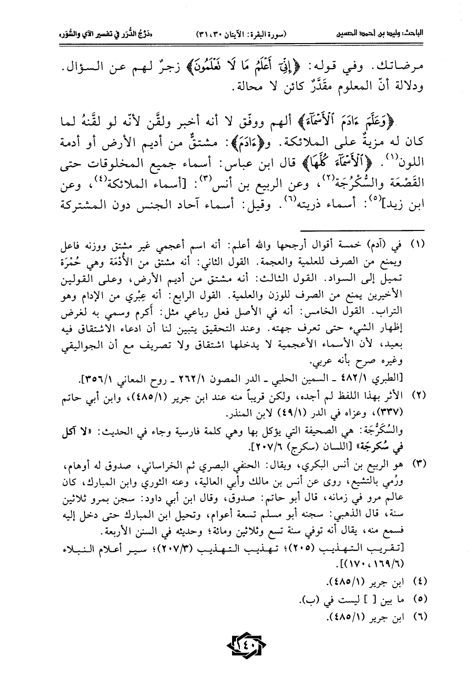 {وَعَلَّمَ آدَمَ الْأَسْمَاءَ} ألهم ووفّق لا أنه أخبر ولقَّن لأنّه لو لقَّنهُ لما كان له مزيةٌ على الملائكة. و {آدَمَ}: مشتقٌّ من أديم الأرض أو أدمة اللون (¬1). {الْأَسْمَاءَ كُلَّهَا} قال ابن عباس: أسماء جميع المخلوقات حتى القَصْعَة والسُّكْرُجَة (¬2)، وعن الربيع بن أنس (¬3): [أسماء الملائكة (¬4)، وعن ابن زيد] (¬5): أسماء ذريته (¬6). وقيل: أسماء آحاد الجنس دون المشتركة