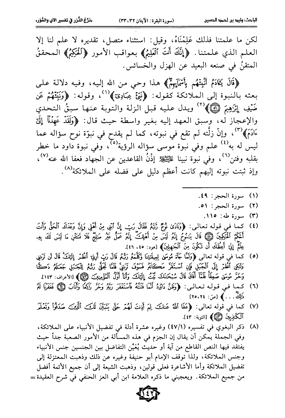 (¬8) ذكر البغوي في تفسيره (1/ 47) وغيره عشرة أدلة في تفضيل الأنبياء على الملائكة، وفي الجملة يمكن أن يقال إن الجزم في هذه المسألة من الأمور الصعبة جدًا حيث يفتقد فيها النص القاطع من آية أو حديث يُعَيِّن التفاضل بين الجنسين جنس الأنبياء وجنس الملائكة، ولذا توقف الإِمام أبو حنيفة وغيره عن ذلك وذهبت المعتزلة إلى تفضيل الملائكة وأما الأشاعرة فعلى قولين، وذهبت الشيعة إلى أن جميع الأئمة أفضل من جميع الملائكة. ويعجبني ما ذكره العلامة ابن أبي العز الحنفي في شرح العقيدة =