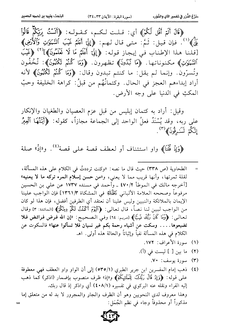 (¬4) ذهب إمام المفسرين ابن جرير الطبري (1/ 535) إلى أن الواو واو العطف فهي معطوفة على قوله: {وَإِذْ قَالَ رَبُّكَ لِلْمَلَائِكَةِ} و"إذ" ظرف منصوب بإضمار (اذكر) كما ذهب إليه الفراء ونقله عنه البركوي في تفسيره (1/ 408) أي واذكر إذ قال ربك. وهذا معروف لدى النحويين وهو أن الظرف والجار والمجرور لا بد له من متعلق إما مذكورًا أو محذوفًا وجاء في نظم الجُمَل: =