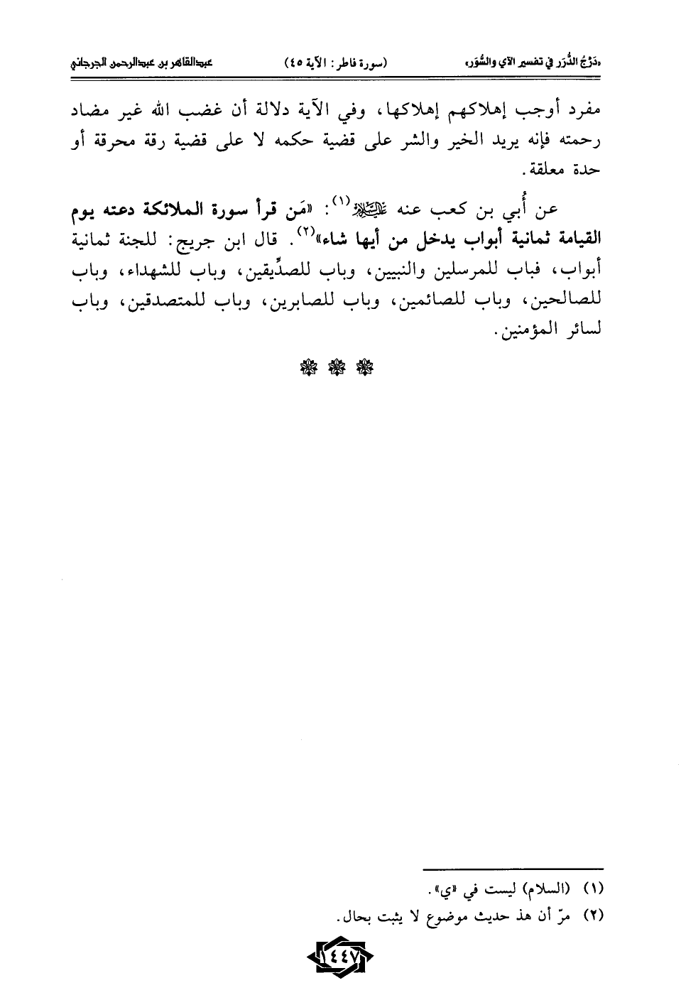 عن أُبي بن كعب عنه -عليه السلام- (1): "مَن قرأ سورة الملائكة دعته يوم القيامة ثمانية أبواب يدخل من أيها شاء" (2). قال ابن جريج: للجنة ثمانية أبواب، فباب للمرسلين والنبيين، وباب للصدِّيقين، وباب للشهداء، وباب للصالحين، وباب للصائمين، وباب للصابرين، وباب للمتصدقين، وباب لسائر المؤمنين.