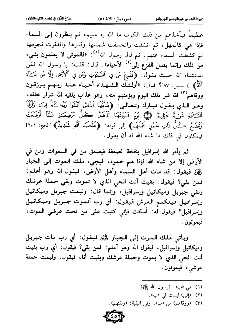 ويأتي ملك الموت إلى الجبار -عَزَّوَجَلَّ- فيقول: أي رب مات جبريل وميكائيل وإسرافيل، فيقول الله وهو أعلم: فمن بقي؟ فيقول: أي رب بقيت أنت الحي الذي لا يموت وحملة عرشك وبقيت أنا، فيقول: وليمت حملة عرشي، فيموتون.