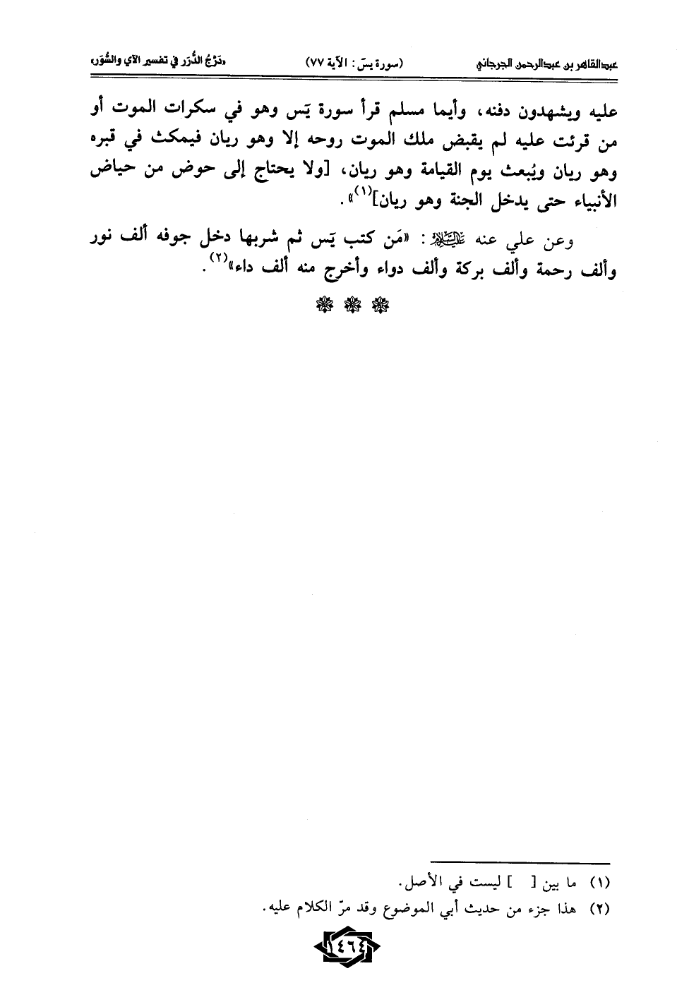 عليه ويشهدون دفنه، وأيما مسلم قرأ سورة يس وهو في سكرات الموت أو من قرئت عليه لم يقبض ملك الموت روحه إلا وهو ريان فيمكث في قبره وهو ريان ويبعث يوم القيامة وهو ريان، [ولا يحتاج إلى حوض من حياض الأنبياء حتى يدخل الجنة وهو ريان] (¬1) ".
