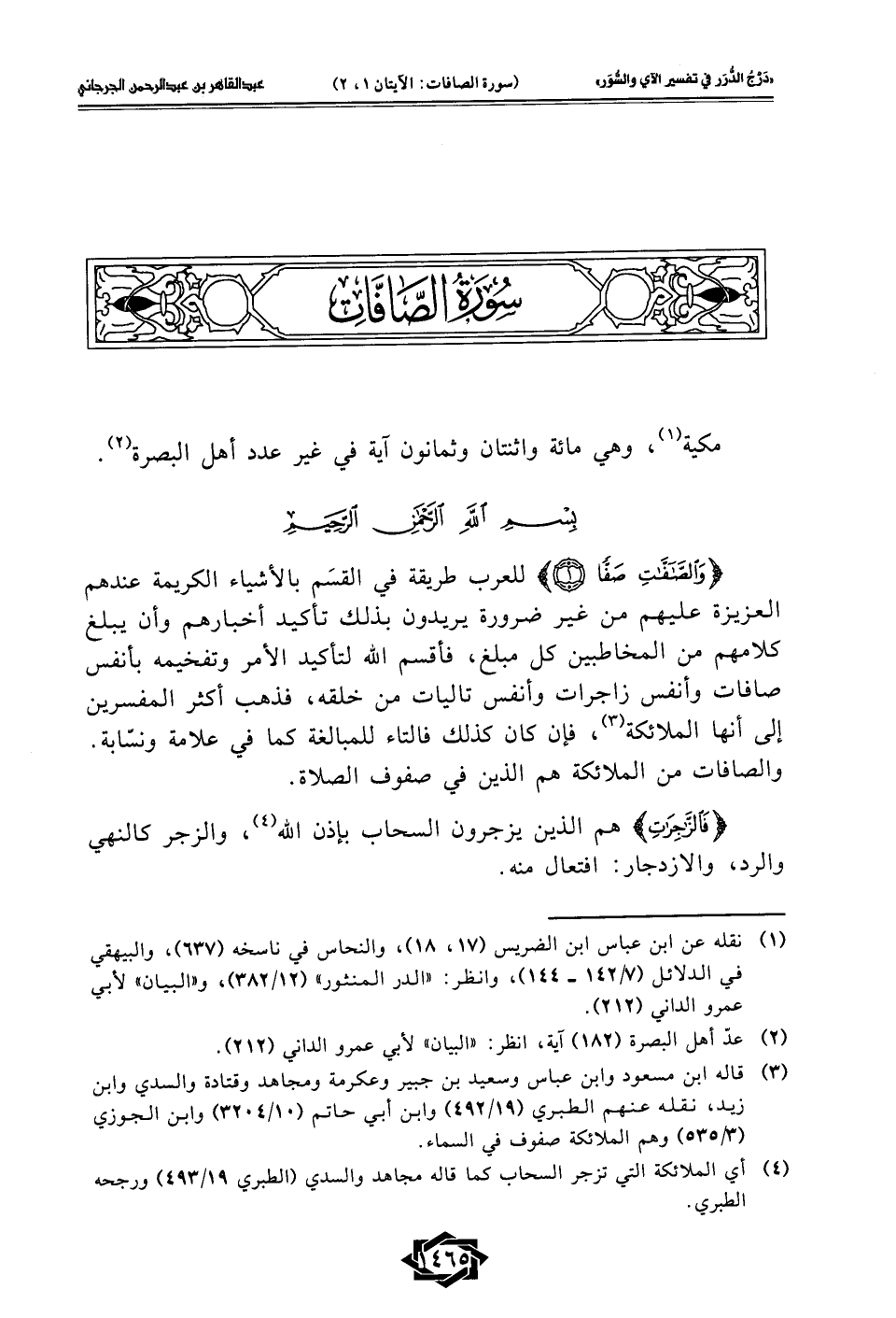 {وَالصَّافَّاتِ صَفًّا (1)} للعرب طريقة في القسَم بالأشياء الكريمة عندهم العزيزة عليهم من غير ضرورة يريدون بذلك تأكيد أخبارهم وأن يبلغ كلامهم من المخاطبين كل مبلغ، فأقسم الله لتأكيد الأمر وتفخيمه بأنفس صافات وأنفس زاجرات وأنفس تاليات من خلقه، فذهب أكثر المفسرين إلى أنها الملائكة (¬3)، فإن كان كذلك فالتاء للمبالغة كما في علامة ونسّابة. والصافات من الملائكة هم الذين في صفوف الصلاة.