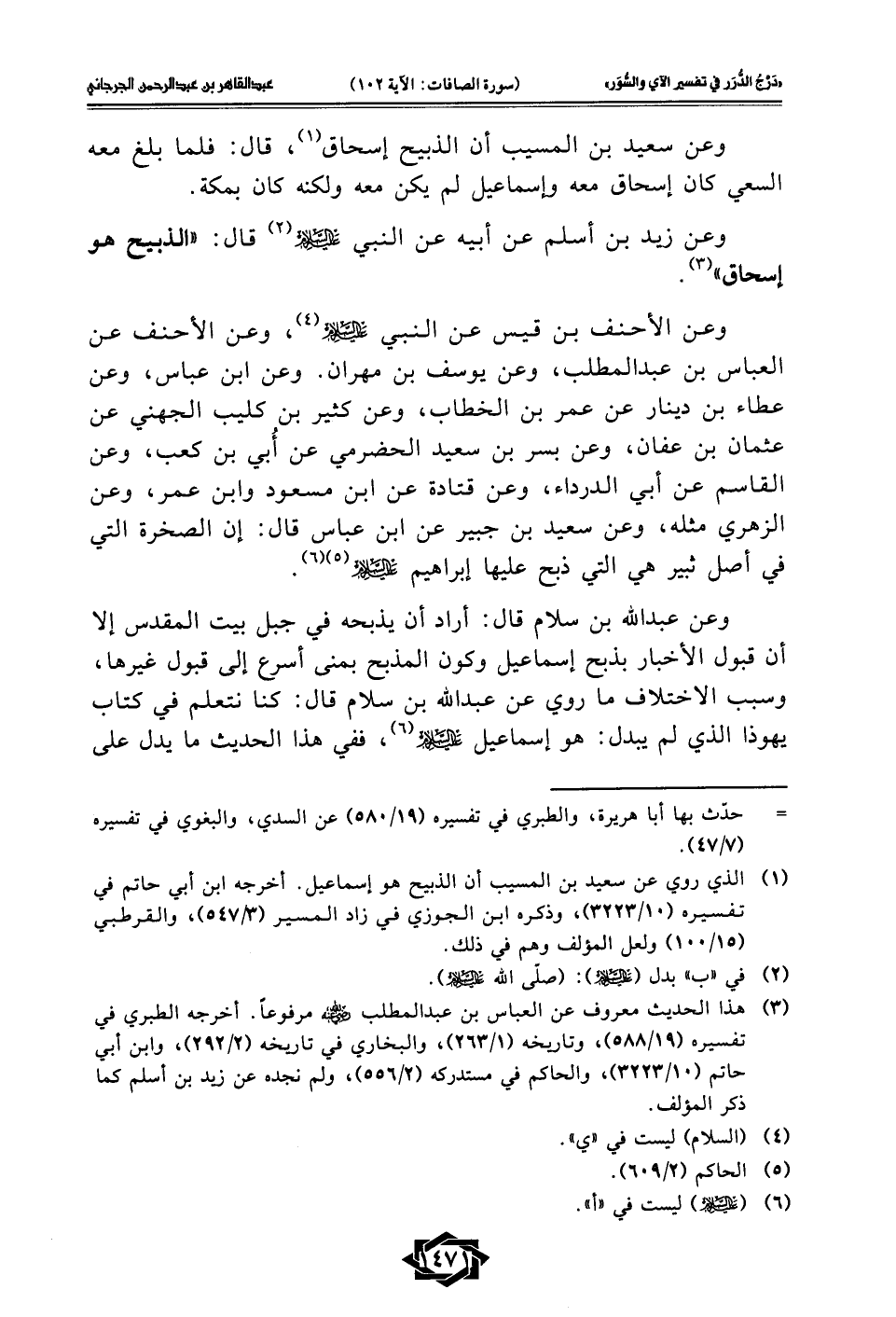 (¬1) الذي روي عن سعيد بن المسيب أن الذبيح هو إسماعيل. أخرجه ابن أبي حاتم في تفسيره (10/ 3223)، وذكره ابن الجوزي في زاد المسير (3/ 547)، والقرطبي (15/ 100) ولعل المؤلف وهم في ذلك.