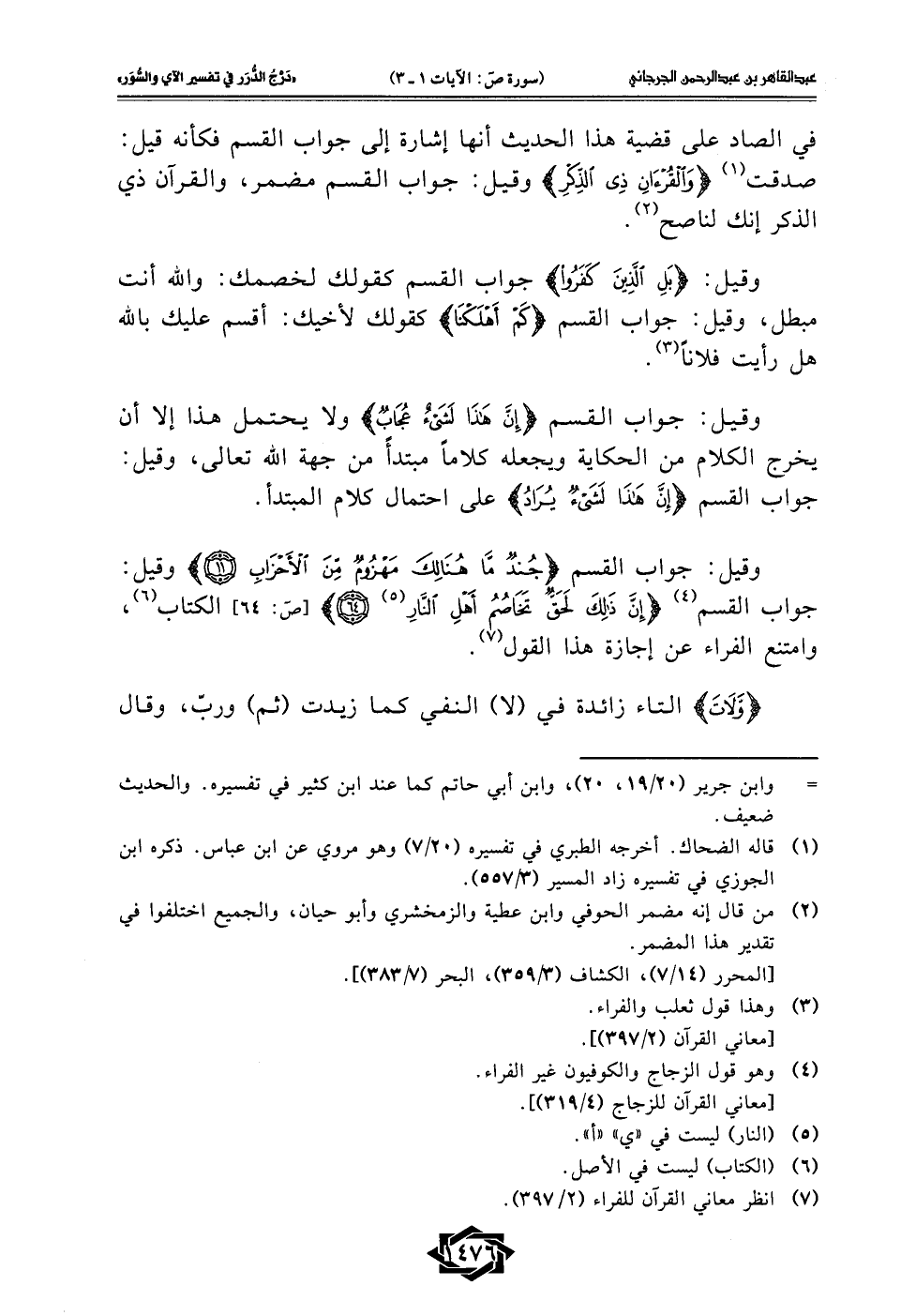 وقيل: جواب القسم {جُنْدٌ مَا هُنَالِكَ مَهْزُومٌ مِنَ الْأَحْزَابِ (11)} وقيل: جواب القسم (¬4) {إِنَّ ذَلِكَ لَحَقٌّ تَخَاصُمُ أَهْلِ النَّارِ (¬5) (64)} [صَ: 64] الكتاب (¬6)، وامتنع الفراء عن إجازة هذا القول (¬7).