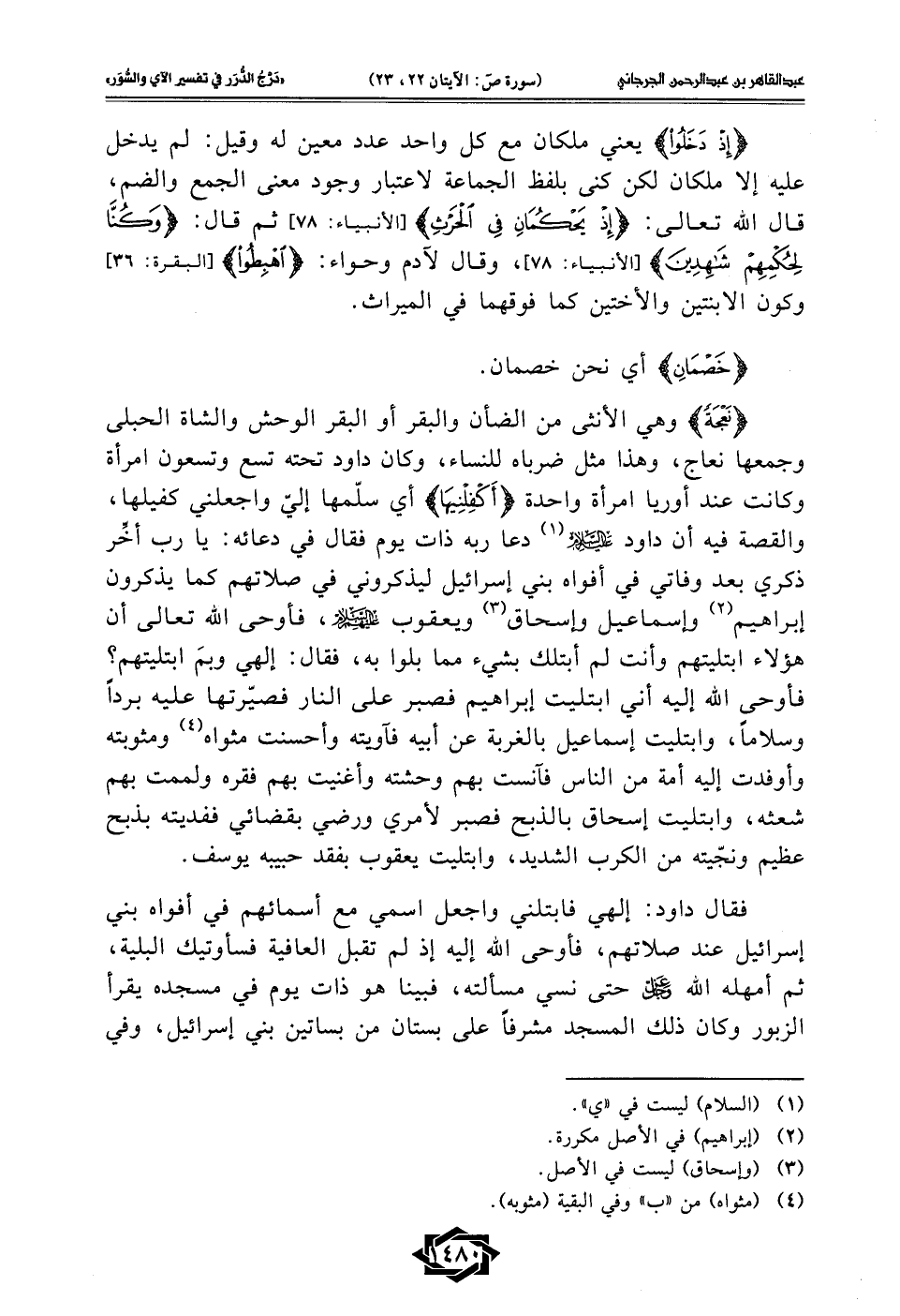 {نَعْجَةً} وهي الأنثى من الضأن والبقر أو البقر الوحش والشاة الحبلى وجمعها نعاج، وهذا مثل ضرباه للنساء، وكان داود تحته تسع وتسعون امرأة وكانت عند أوريا امرأة واحدة {أَكْفِلْنِيهَا} أي سلّمها إليّ واجعلني كفيلها، والقصة فيه أن داود -عليه السلام- (¬1) دعا ربه ذات يوم فقال في دعائه: يا رب أخِّر ذكري بعد وفاتي في أفواه بني إسرائيل ليذكروني في صلاتهم كما يذكرون إبراهيم (¬2) وإسماعيل وإسحاق (¬3) ويعقوب -عليه السلام-، فأوحى الله تعالى أن هؤلاء ابتليتهم وأنت لم أبتلك بشيء مما بلوا به، فقال: إلهي وبمَ ابتليتهم؟ فأوحى الله إليه أني ابتليت إبراهيم فصبر على النار فصيّرتها عليه بردًا وسلامًا، وابتليت إسماعيل بالغربة عن أبيه فآويته وأحسنت مثواه (¬4) ومثوبته وأوفدت إليه أمة من الناس فآنست بهم وحشته وأغنيت بهم فقره ولممت بهم شعثه، وابتليت إسحاق بالذبح فصبر لأمري ورضي بقضائي ففديته بذبح عظيم ونجّيته من الكرب الشديد، وابتليت يعقوب بفقد حبيبه يوسف.