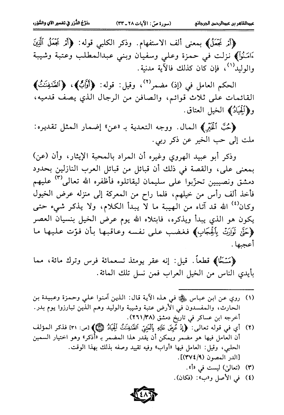 وذكر أبو عبيد الهروي وغيره أن المراد بالمحبة الإيثار، وأن (عن) بمعنى على، والقصة في ذلك أن قبائل من قبائل العرب النازلين بحدود دمشق ونصيبين تحزّبوا على سليمان ليقاتلوه فأظفره الله تعالى (¬3) عليهم فأخذ ألف رأس من خيلهم، فلما راح من المعركة إلى منزله عرض الخيول وكان (¬4) الله قد آتاه من الهيبة ما لا يبدأ الكلام، ولا يذكر شيء حتى يكون هو الذي يبدأ ويذكره، فابتلاه الله يوم عرض الخيل بنسيان العصر {حَتَّى تَوَارَتْ بِالْحِجَابِ} فغضب على نفسه وعاقبها بأن فوّت عليها ما أعجبها.