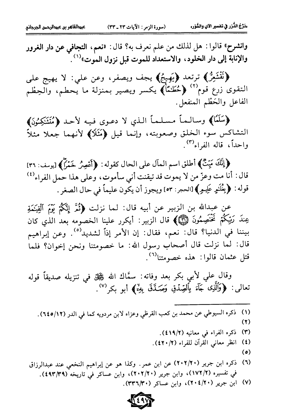 عن عبد الله بن الزبير عن أبيه قال: لما نزلت {ثُمَّ إِنَّكُمْ يَوْمَ الْقِيَامَةِ عِنْدَ رَبِّكُمْ تَخْتَصِمُونَ (31)} قال الزبير: أيكرر علينا الخصومه بعد الذي كان بيننا في الدنيا؟ قال: نعم، فقال: إن الأمر إذًا لشديد (¬5). وعن إبراهيم قال: لما نزلت قال أصحاب رسول الله: ما خصومتنا ونحن إخوان؟ فلما قتل عثمان قالوا: هذه خصومتنا (¬6).