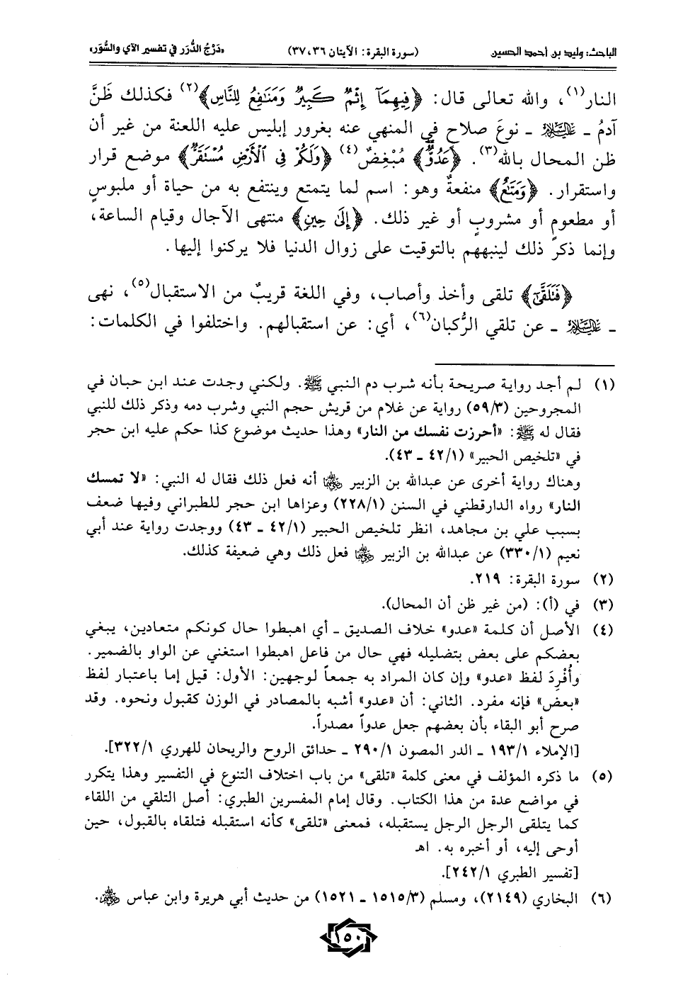 (¬5) ما ذكره المؤلف في معنى كلمة "تلقى" من باب اختلاف التنوع في التفسير وهذا يتكرر في مواضع عدة من هذا الكتاب. وقال إمام المفسرين الطبري: أصل التلقي من اللقاء كما يتلقى الرجل الرجل يستقبله، فمعنى "تلقى" كأنه استقبله فتلقاه بالقبول، حين أوحى إليه، أو أخبره به. اهـ