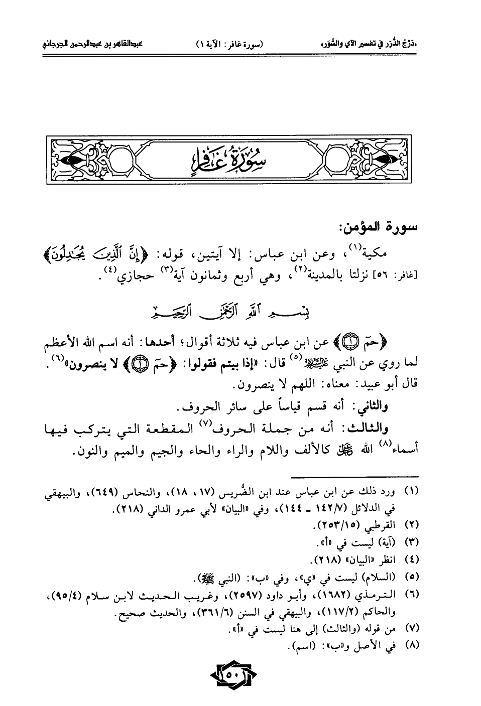 {حم (1)} عن ابن عباس فيه ثلاثة أقوال؛ أحدها: أنه اسم الله الأعظم لما روي عن النبي -عليه السلام- (¬5) قال: "إذا بيتم فقولوا: {حم (1)} لا ينصرون" (¬6). قال أبو عبيد: معناه: اللهم لا ينصرون.