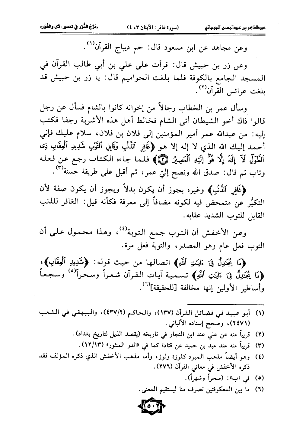 وعن زر بن حبيش قال: قرأت على علي بن أبي طالب القرآن في المسجد الجامع بالكوفة فلما بلغت الحواميم قال: يا زر بن حبيش قد بلغت عرائس القرآن (¬2).