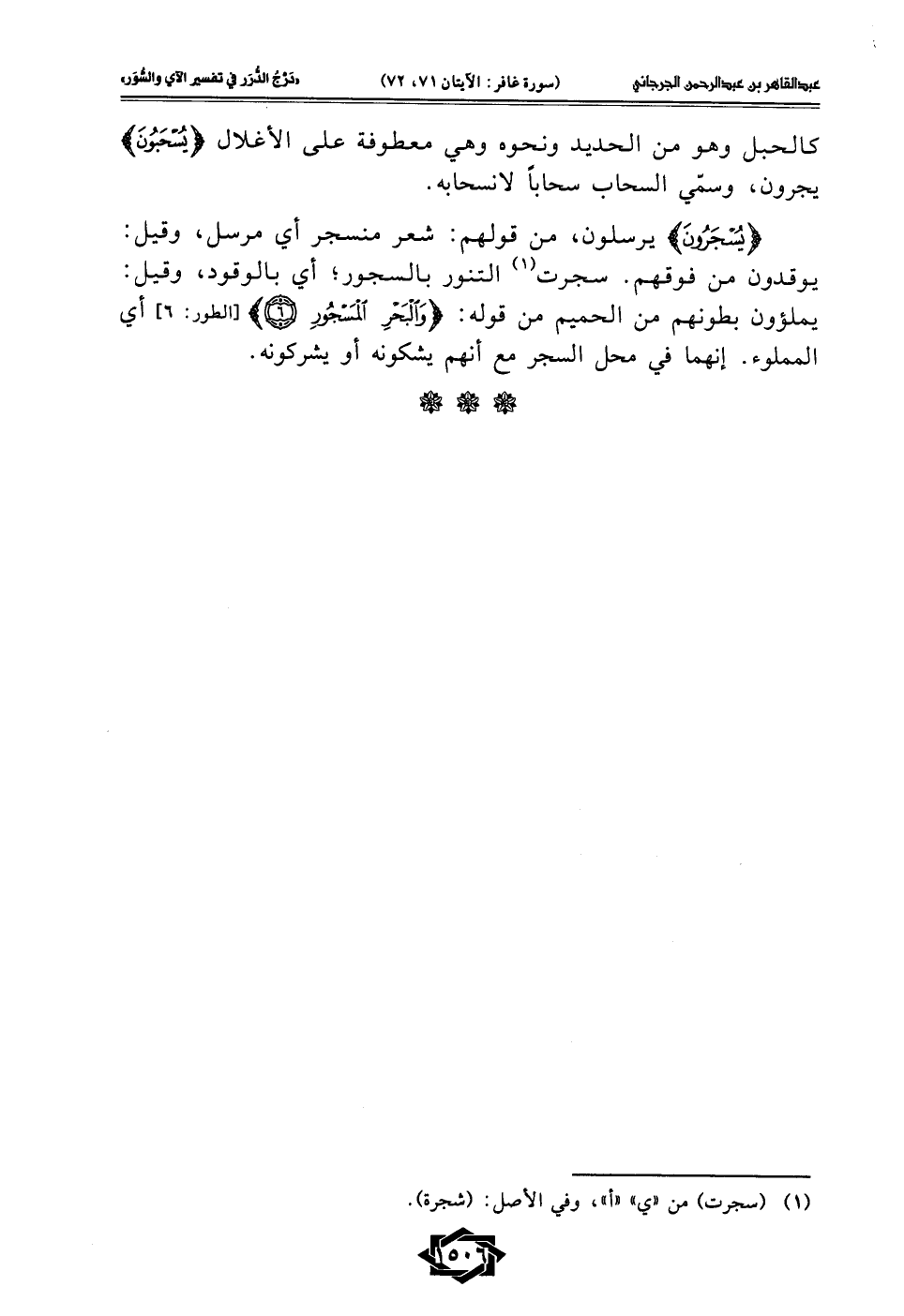 {يُسْجَرُونَ} يرسلون، من قولهم: شعر منسجر أي مرسل، وقيل: يوقدون من فوقهم. سجرت (¬1) التنور بالسجور؛ أي بالوقود، وقيل: يملؤون بطونهم من الحميم من قوله: {وَالْبَحْرِ الْمَسْجُورِ (6)} [الطور: 6]، أي المملوء. إنهما في محل السجر مع أنهم يشكونه أو يشركونه.