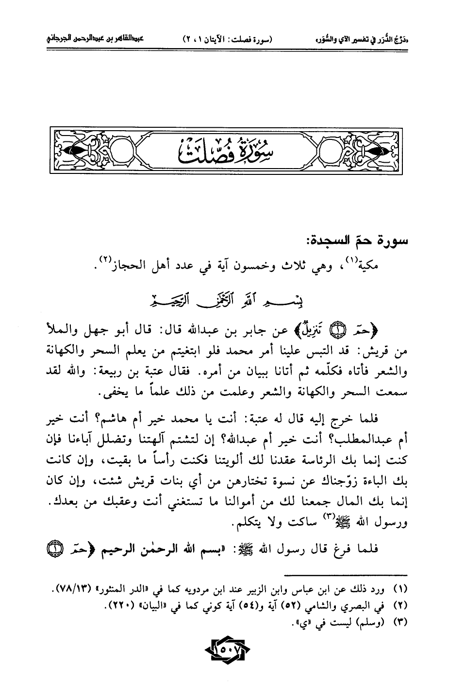 {حم (1) تَنْزِيلٌ} عن جابر بن عبد الله قال: قال أبو جهل والملأ من قريش: قد التبس علينا أمر محمَّد فلو ابتغيتم من يعلم السحر والكهانة والشعر فأتاه فكلّمه ثم أتانا ببيان من أمره. فقال عتبة بن ربيعة: والله لقد سمعت السحر والكهانة والشعر وعلمت من ذلك علمًا ما يخفى.