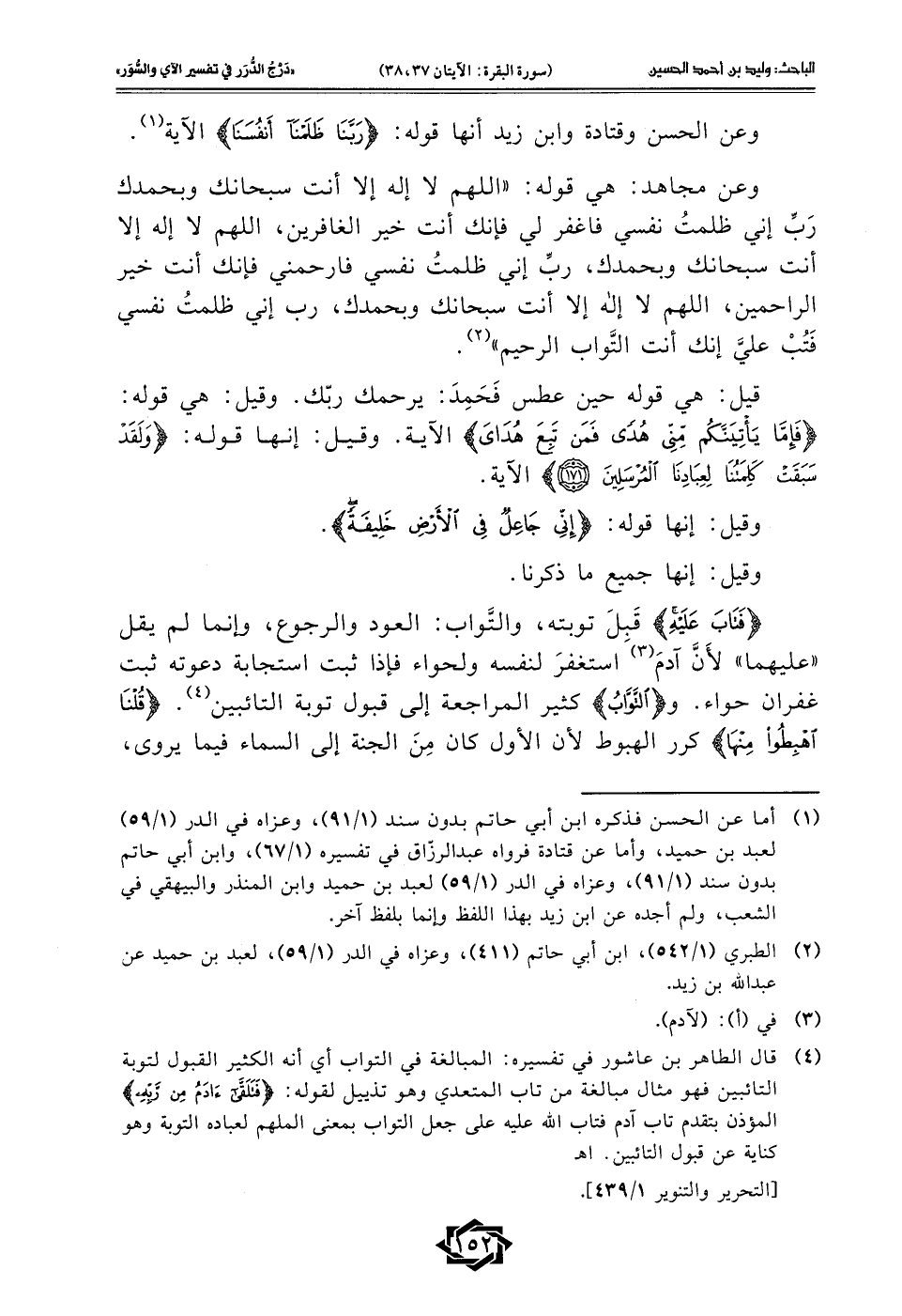 {فَتَابَ عَلَيْهِ} قَبِلَ توبته، والتَّواب: العود والرجوع، وإنما لم يقل "عليهما" لأَنَّ آدمَ (¬3) استغفرَ لنفسه ولحواء فإذا ثبت استجابة دعوته ثبت غفران حواء. و {التَّوَّابُ} كثير المراجعة إلى قبول توبة التائبين (¬4). {قُلْنَا اهْبِطُوا مِنْهَا} كرر الهبوط لأن الأول كان مِنَ الجنة إلى السماء فيما يروى،