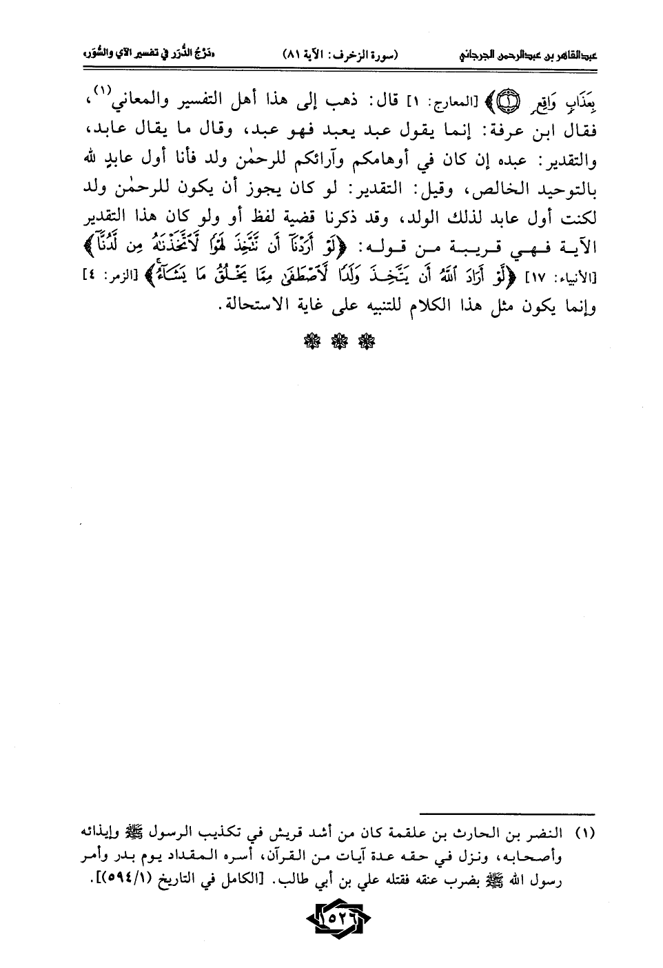 (¬1) النضر بن الحارث بن علقمة كان من أشد قريش في تكذيب الرسول - صلى الله عليه وسلم - وايذائه وأصحابه، ونزل في حقه عدة آيات من القرآن، أسره المقداد يوم بدر وأمر رسول الله - صلى الله عليه وسلم - بضرب عنقه فقتله علي بن أبي طالب. [الكامل في التاريخ (1/ 594)].